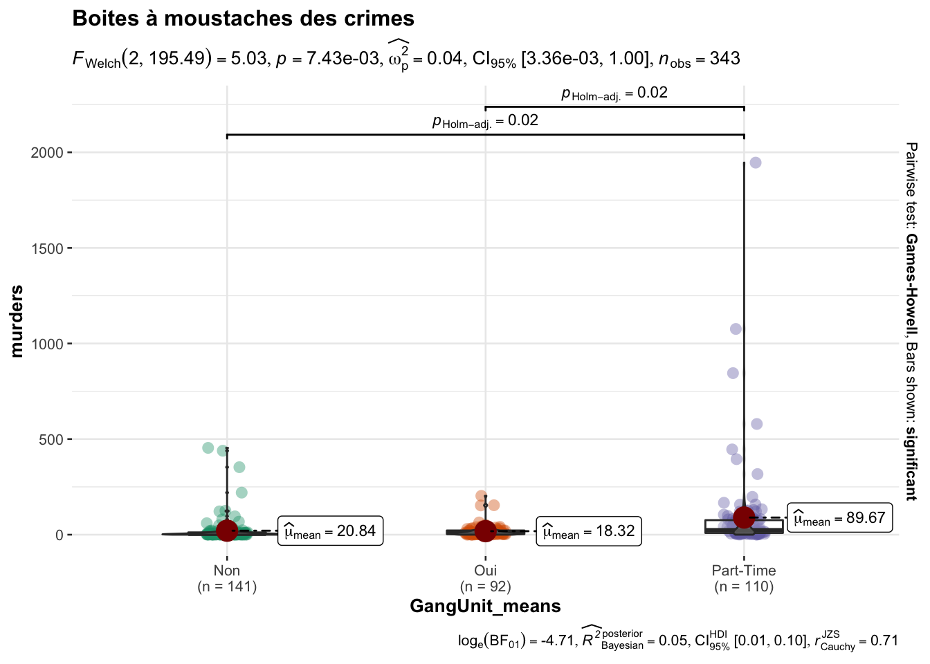 Dû à des valeurs manquantes, notre représentation porte sur \(343\) observations. Les boites à moustache indiquent qu’en moyenne, le nombre de meurtres varie lors que gangUnit change de modalité. Passons à l’anova pour en savoir plus.