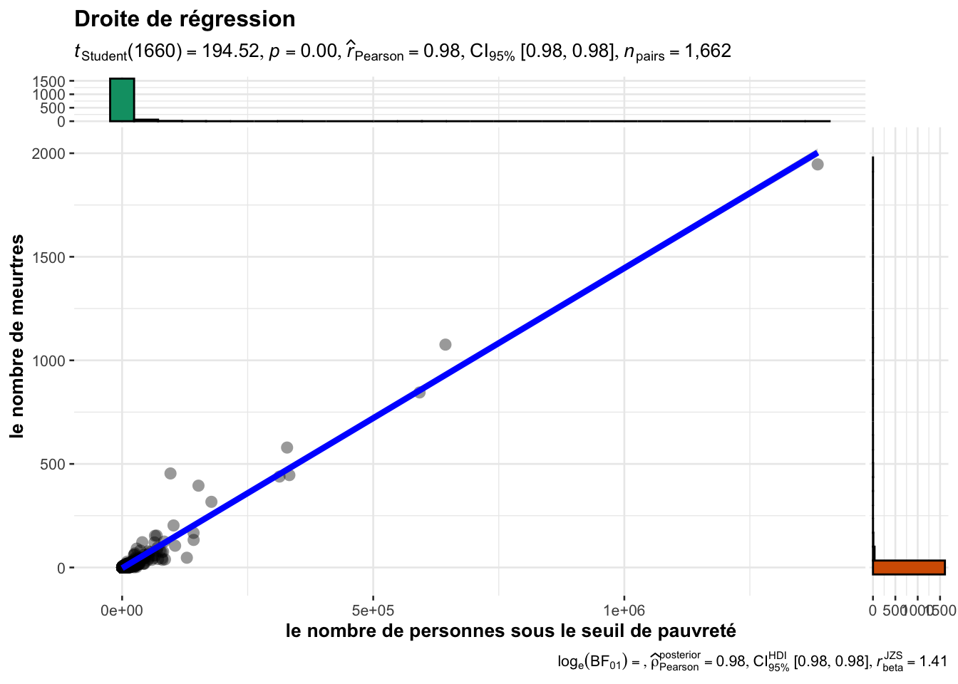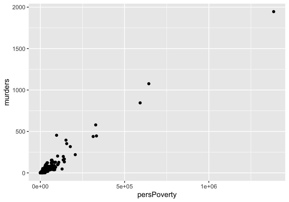 Le tableau précédent indique les variables fortement corrélées avec notre \(output\) murders. Prenons l’exemple de la variable persPoverty qui représente le nombre de personnes sous le seuil de pauvreté.
