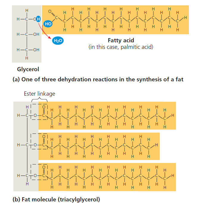 Glicerolio hidroksilo grupės jungiasi su kiekvienos RR karboksiline grupe ir sudaro riebalą arba triacilgliceridą. Tiesa, ant maisto produktų būna nurodyta, jog sudėtyje yra sočių arba nesočių riebalų rūgščių. RR sotumas priklauso nuo dvigubų anglies jungčių skaičiaus. Sotieji riebalai yra prisotinti vandeniliu - jie atrodo taip, kaip iliustracijoje aukščiau. Struktūriškai sotieji riebalai yra kompaktiški ir dėl to kambario temperatūroje įprastai yra kieti (pavyzdžiui, sviestas arba taukai13).