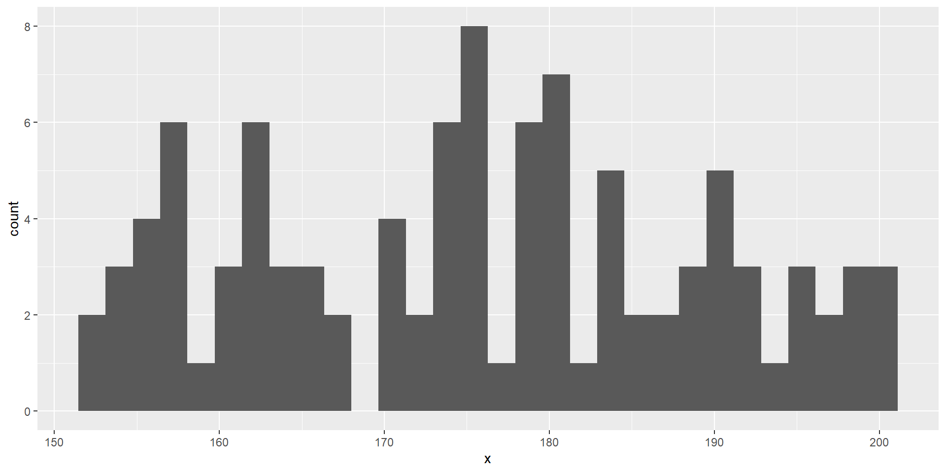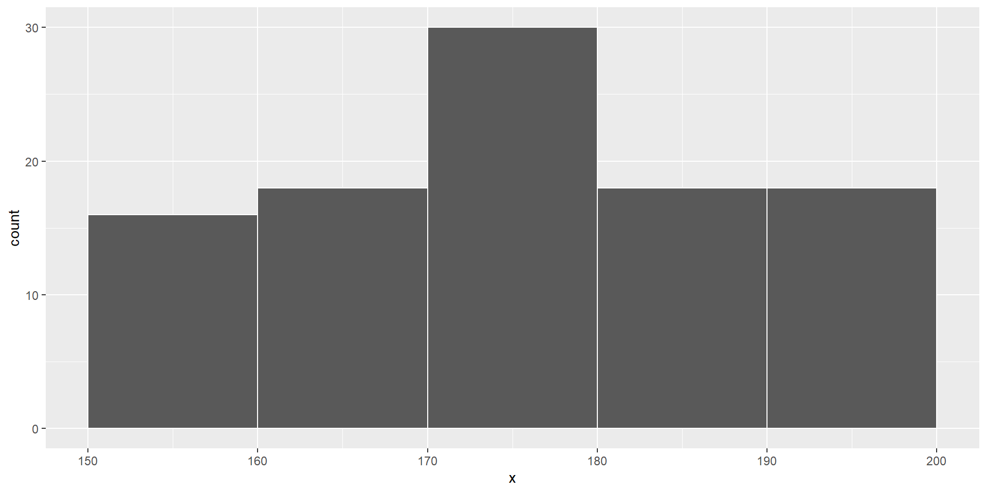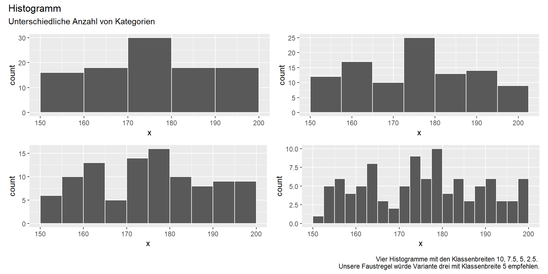 Vier Darstellungen mit unterschiedlichen Klassenbreiten: 10, 7.5, 5, und 2.5 [cm].