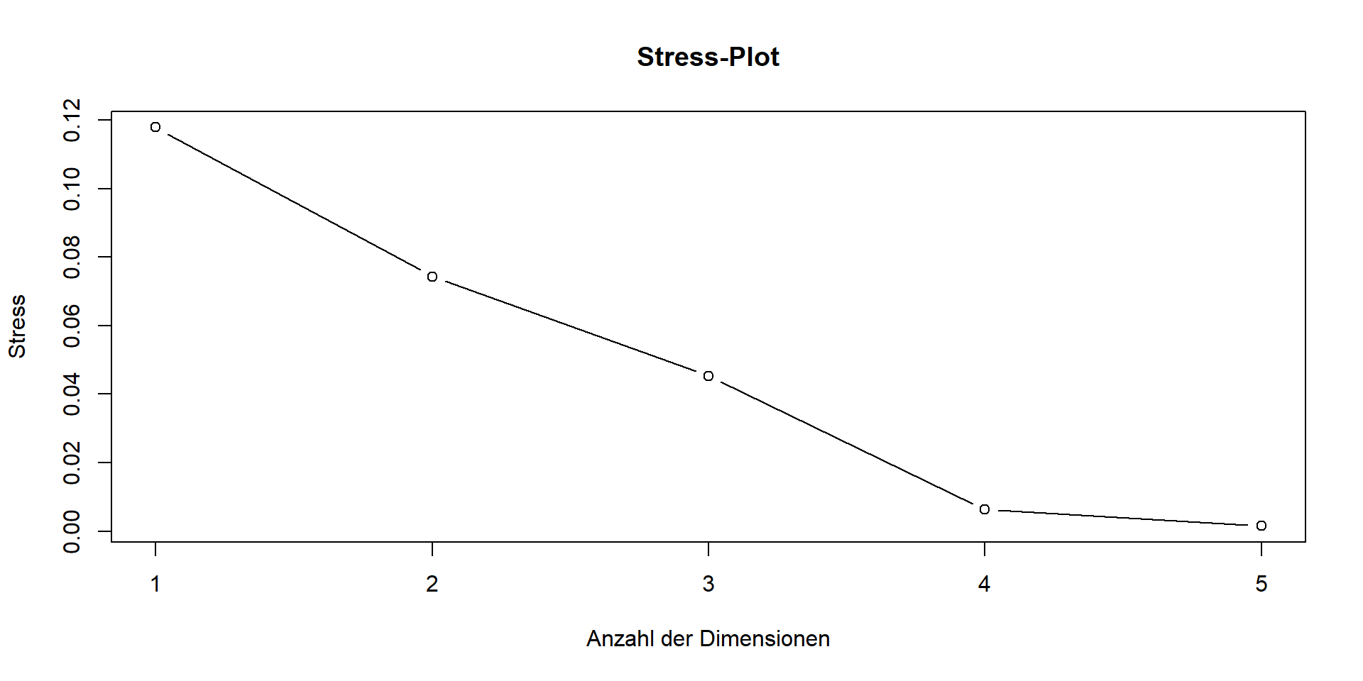 • Stress ( 0,05 ) bis ( 0,1 ): Gute Anpassung. Die MDS-Lösung ist akzeptabel.
