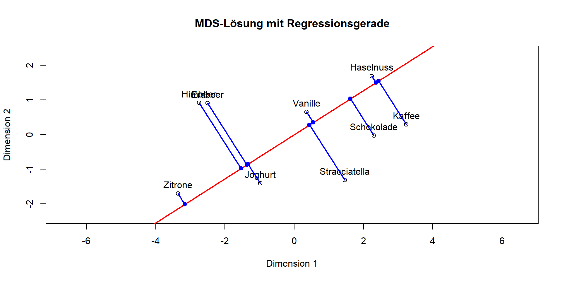 • Wenn die Modellierung erfolgreich ist (signifikantes Ergebnis, hohes R²), bestimmen die Gewichte einen Vektor im MDS-Raum