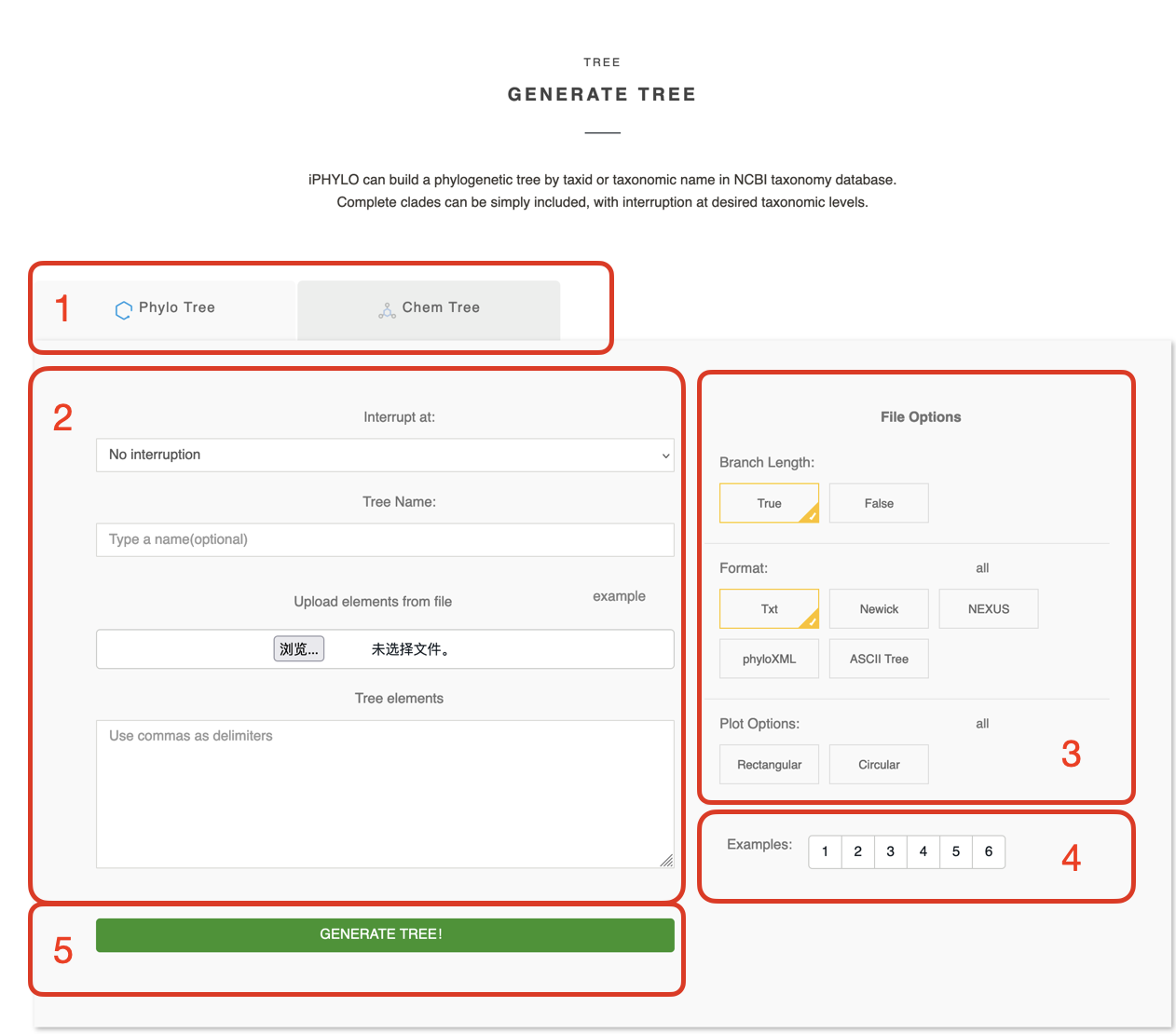 Examples: We have provided 6 examples for biological and chemical trees respectively, which are just a click away to try. Corresponding descriptions are provided below each example input.