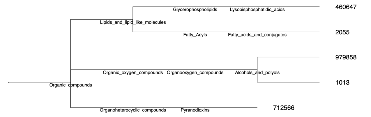 The leaf nodes (the last node of each branch) of the chemical tree are labeled with ids, and the other internal nodes are labeled with compound category names, like “Glycerolipids”. Don’t worry about figuring out which compounds the ids correspond to, we’ll provide a table of correspondences.