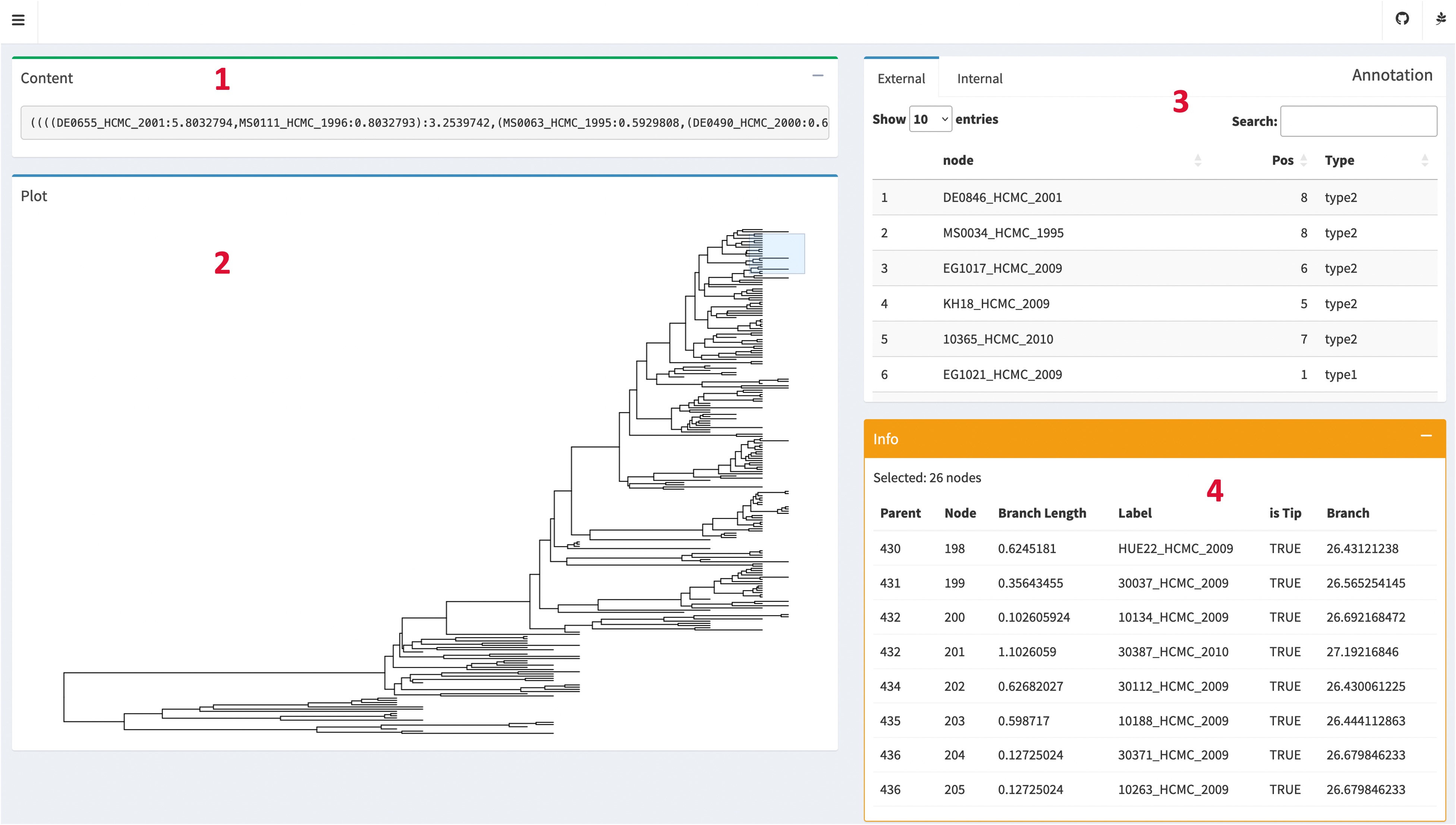 - Info Box: The Info Box displays information about the nodes. When users perform a selection by dragging the mouse cursor on the Plot Box, the Info Box updates to show details such as node labels, branch lengths, parent’s ID and other additional information associated with the selected nodes.