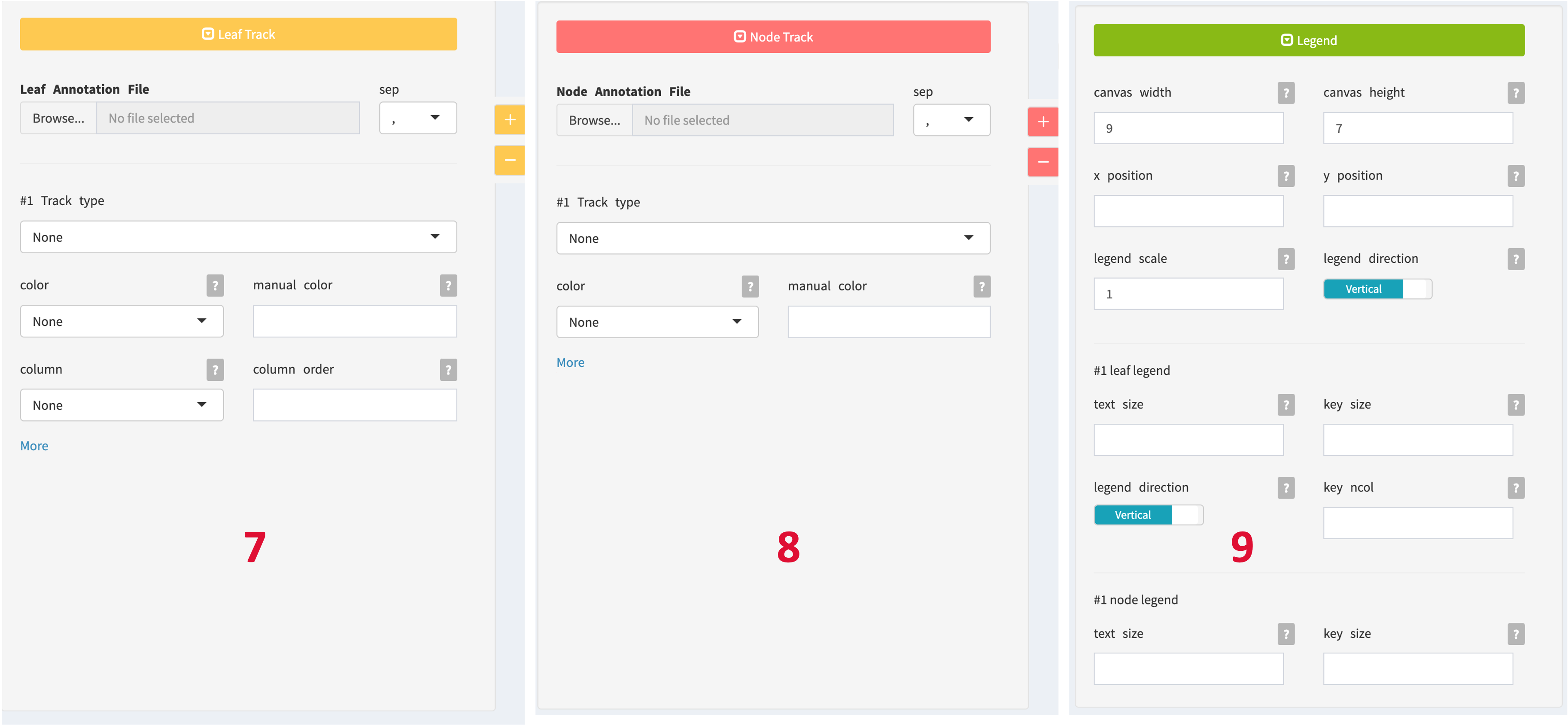 - Leaf Annotation: Use these controls to assign annotation to the external tree nodes. Click the toggle button to collapse or expand the Leaf Annotation section. Click the plus (+) and minus (-) buttons of Leaf Annotation to add or remove annotation tracks.