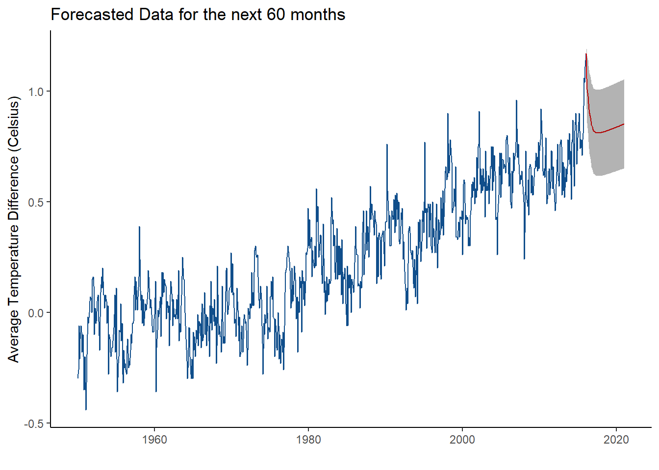 Let’s forecast with our global temperature data now. As we saw, we fit the data with a SARIMA(2,1,3)(1,0,0)12. Now that we have our model, we can simply use the forecast(ts, h) function from the forecast package. As mentioned, h represents the number of observations we want to predict into the future. Let’s say we want to predict 5 years into the future. Since our data ended in December 2016, the next 5 years will include each month from January 2017 to December 2022. Moreover, since our observations were every month, we can set h to \(12 * 5 = 60\). Let’s see what happens.