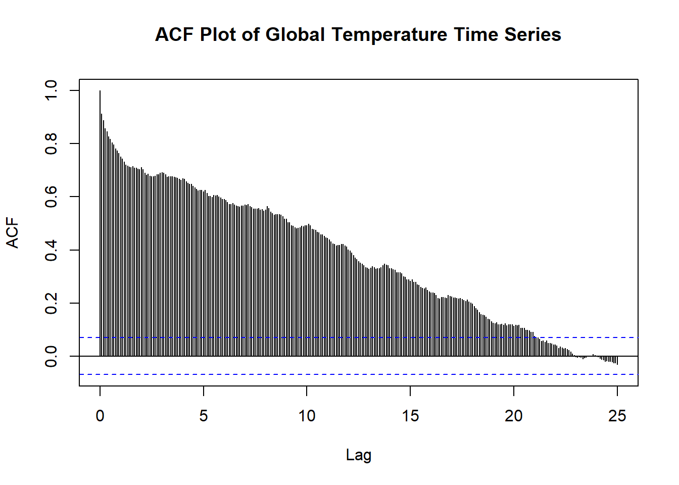 Let’s take a look at the ACF plot of the global temperature time series, using the acf() function in R.
