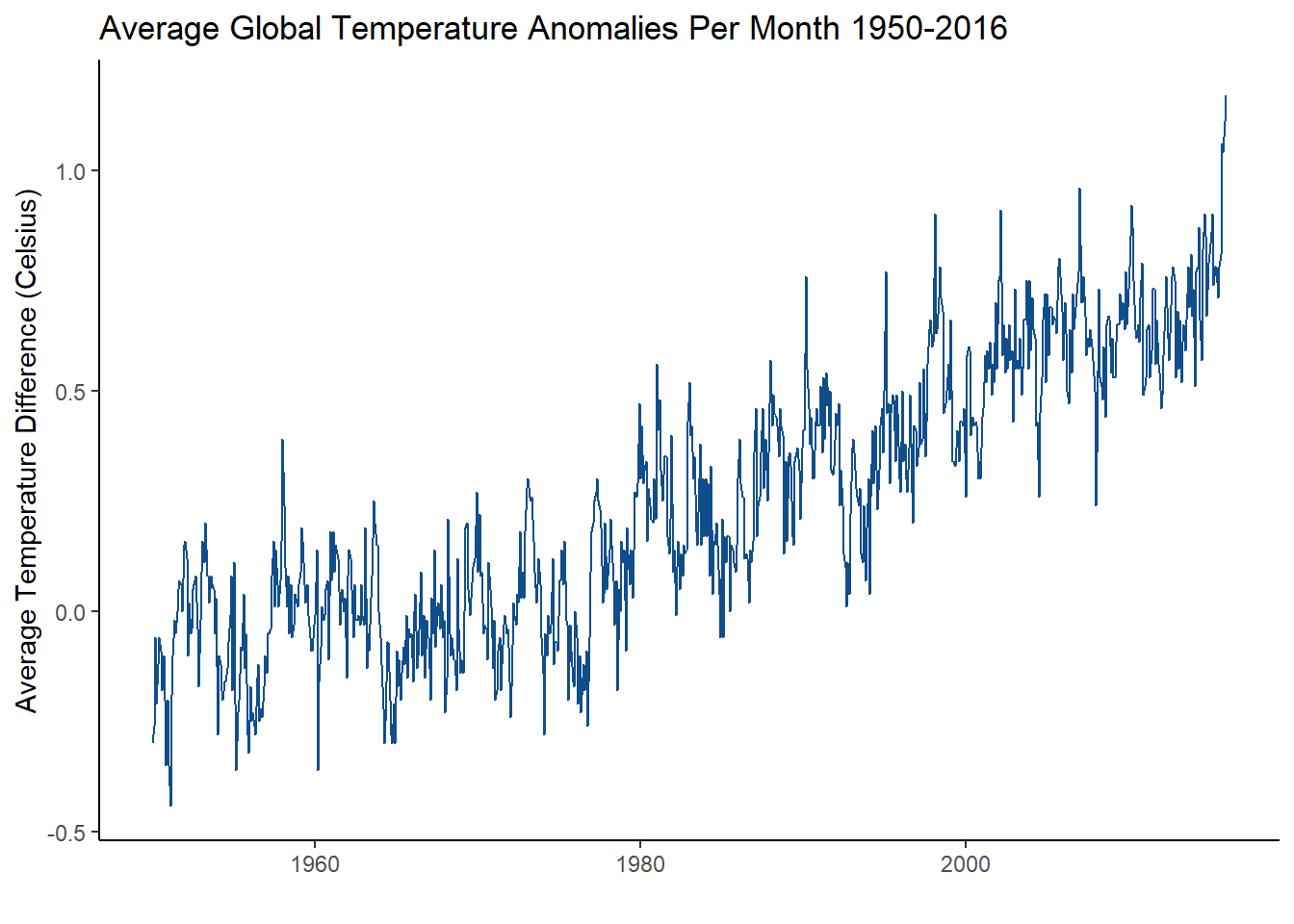 Let’s take a look at an example of time series using real world data. This data set looks at the average global temperature anomalies in celsius per month from January 1950 to December 2016.