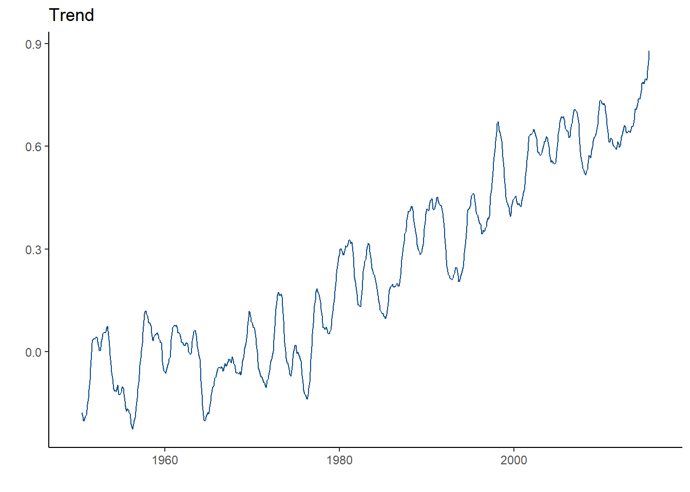 As we can see, there is strong upward trend. This means that the temperature is gradually going up since 1950! What if the trend line was going down? Then you would conclude that the temperature is decreasing. What if it stayed constant? Then, you can conclude that there is no trend!