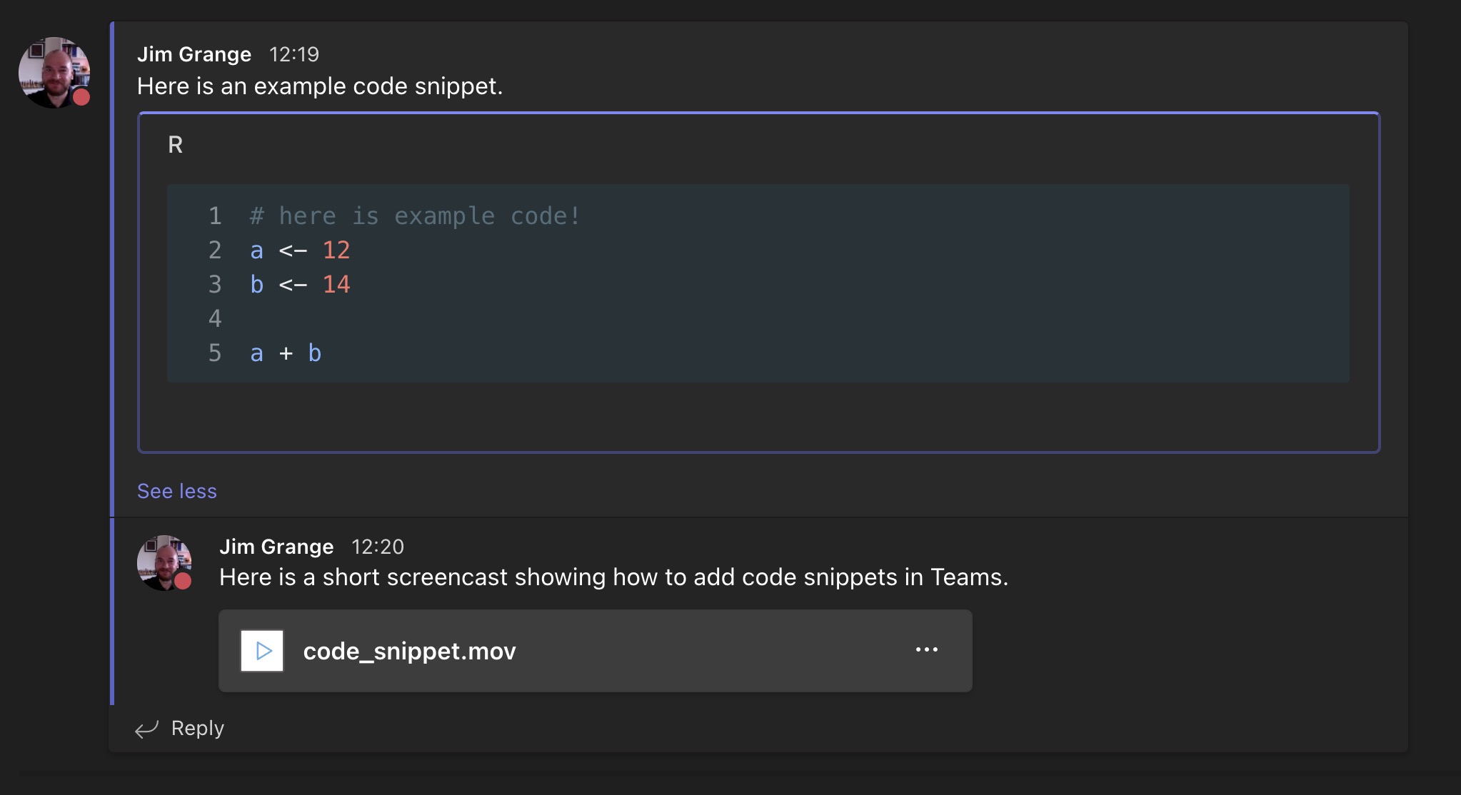 When you post a question, it will help if you also provide the code you are struggling with. Teams is excellent by allowing you to type in properly formatted R code into the channel. Below is an example code snippet in Team, and in the Teams channel you can find a short screencast showing you how to enter formatted R code into the Teams channel.