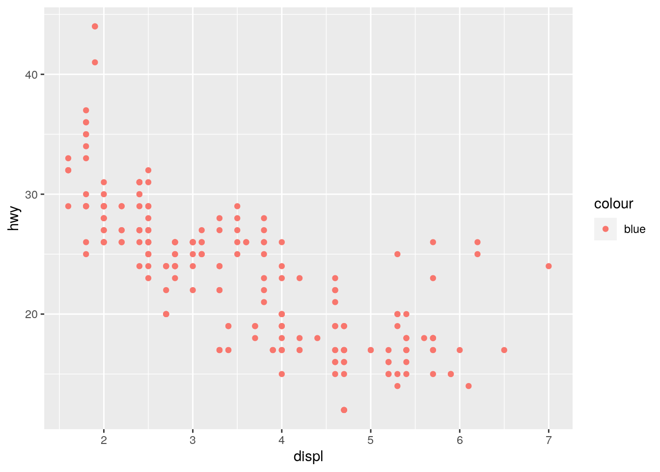 geom_point(mapping = aes(x = displ, y = hwy, color = "blue"))