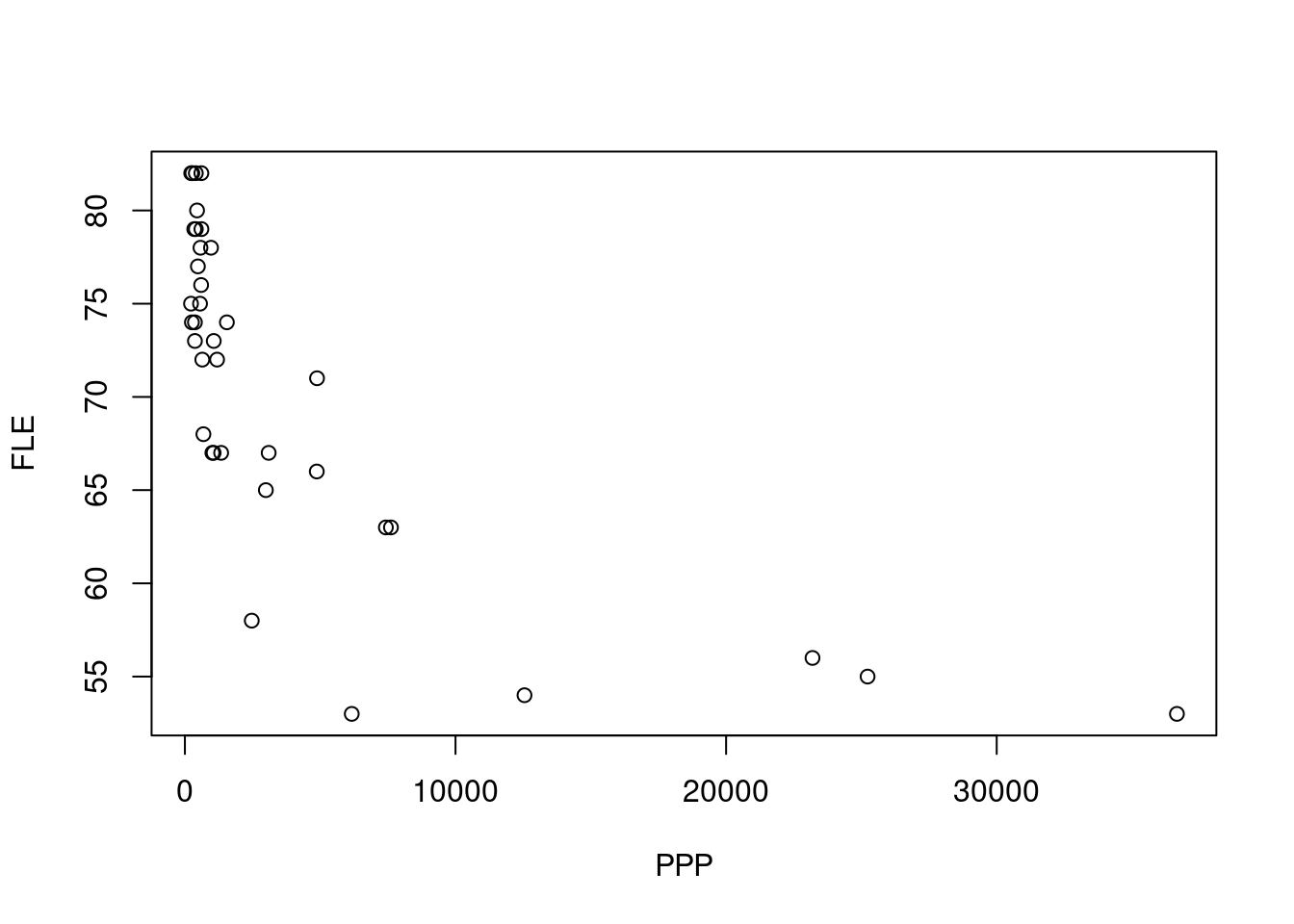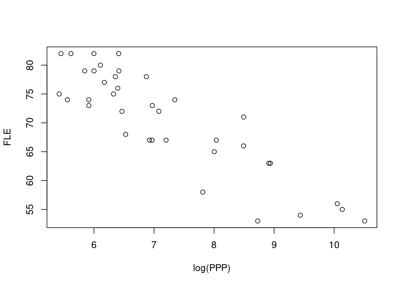 plot(FLE ~ log(PPP), data = life, xlab = "log(PPP)")