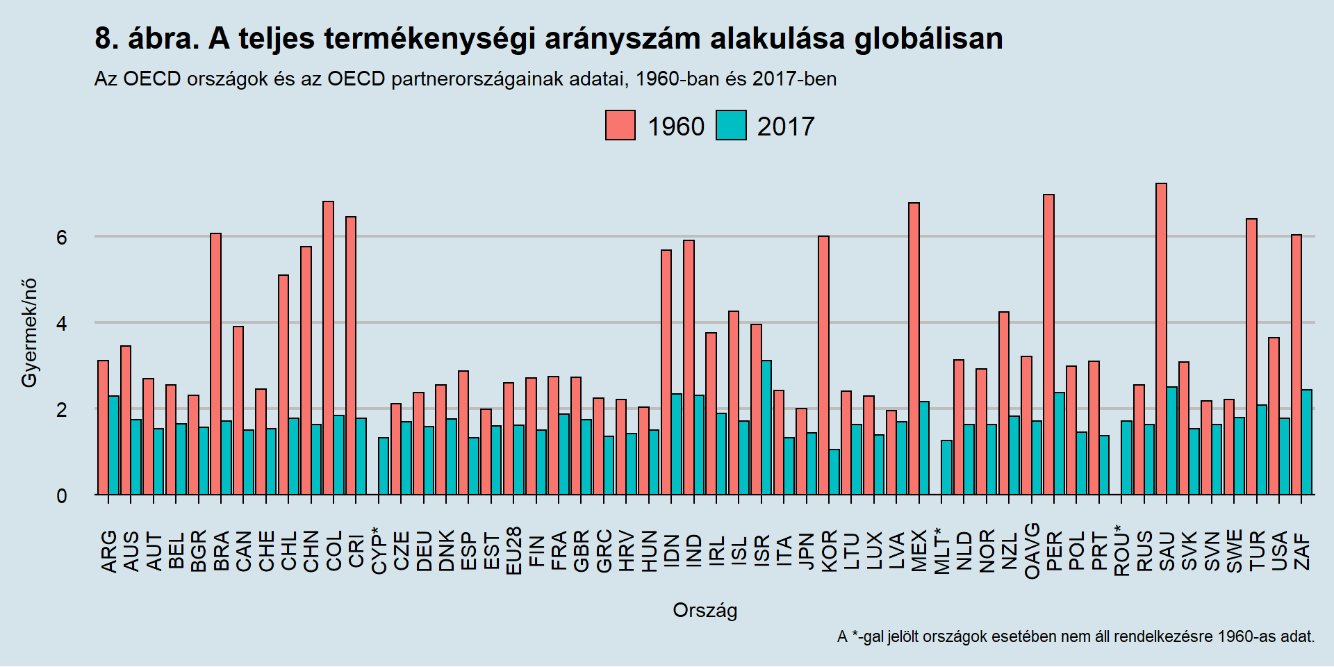 Annak érdekében, hogy a magyar termékenységi rátának szintjéről véleményt formáljunk fontos a megfelelő összehasonlítási alap meghatározása. Elvégre nem mindegy, hogy a 2017-es 1,49-es termékenységi arányunkat Izrael 3,11-es értékével, vagy Dél-Korea 1,05-ös értékéhez mérjük. Maga a TTA mind az OECD országokban, mind az OECD partnerországaiban (Argentína, India, Indonézia, Szaúd-Arábia, Dél-Afrika) jelentősen csökkent a vizsgált időszakban.