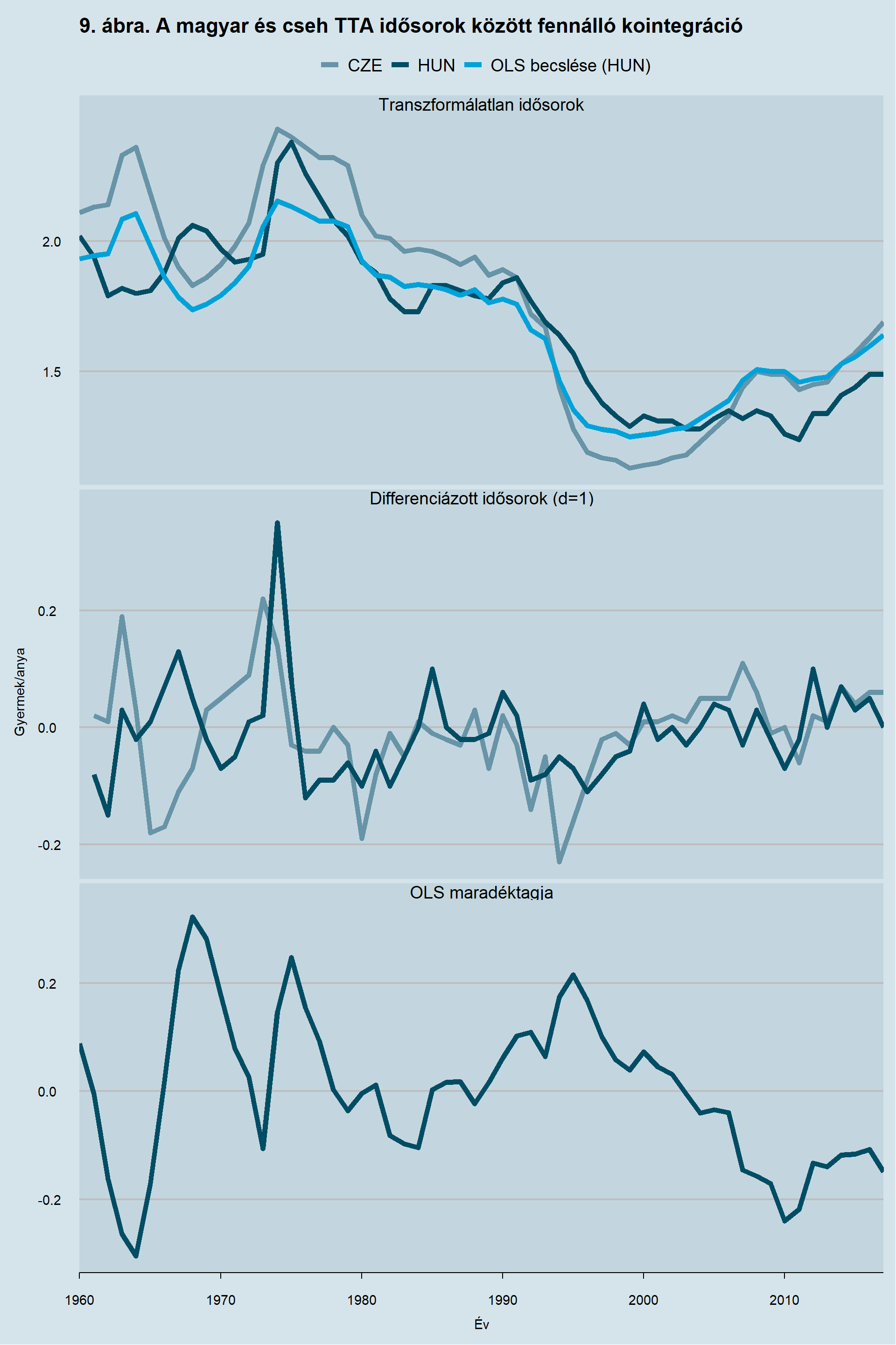 A kointegráció tesztelésének egy példáját bemutatni Magyarország és Csehország termékenységi rátája között. Az általános bemutatáshoz azért esett ezen két idősorra választásom, mert a későbbiekben kifejtésre kerülő eredmények közül a kointegráció ténye megállapításra került. A kointegráció tesztelésének mindhárom lépését prezentálja a 9. ábra.