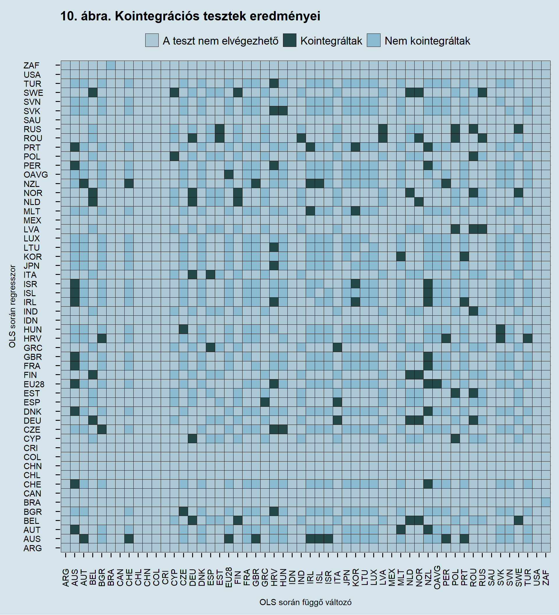 Az imént bemutatott általános modell lefuttatásra került az OECD honlapján elérhető 52 ország termékenységi rátájának idősorából készíthető összes párosításon, továbbá a tesztelésbe felvettem még az OECD országok átlagát és az EU28 átlagát. A tesztek végrehajtása során minden alkalommal általánosított Dickey-Fuller teszt került végrehajtásra és %-os szignifikanciaszinten lettek a döntések meghozva. A kointegrációs tesztek eredményét a 10. ábra szemlélteti.