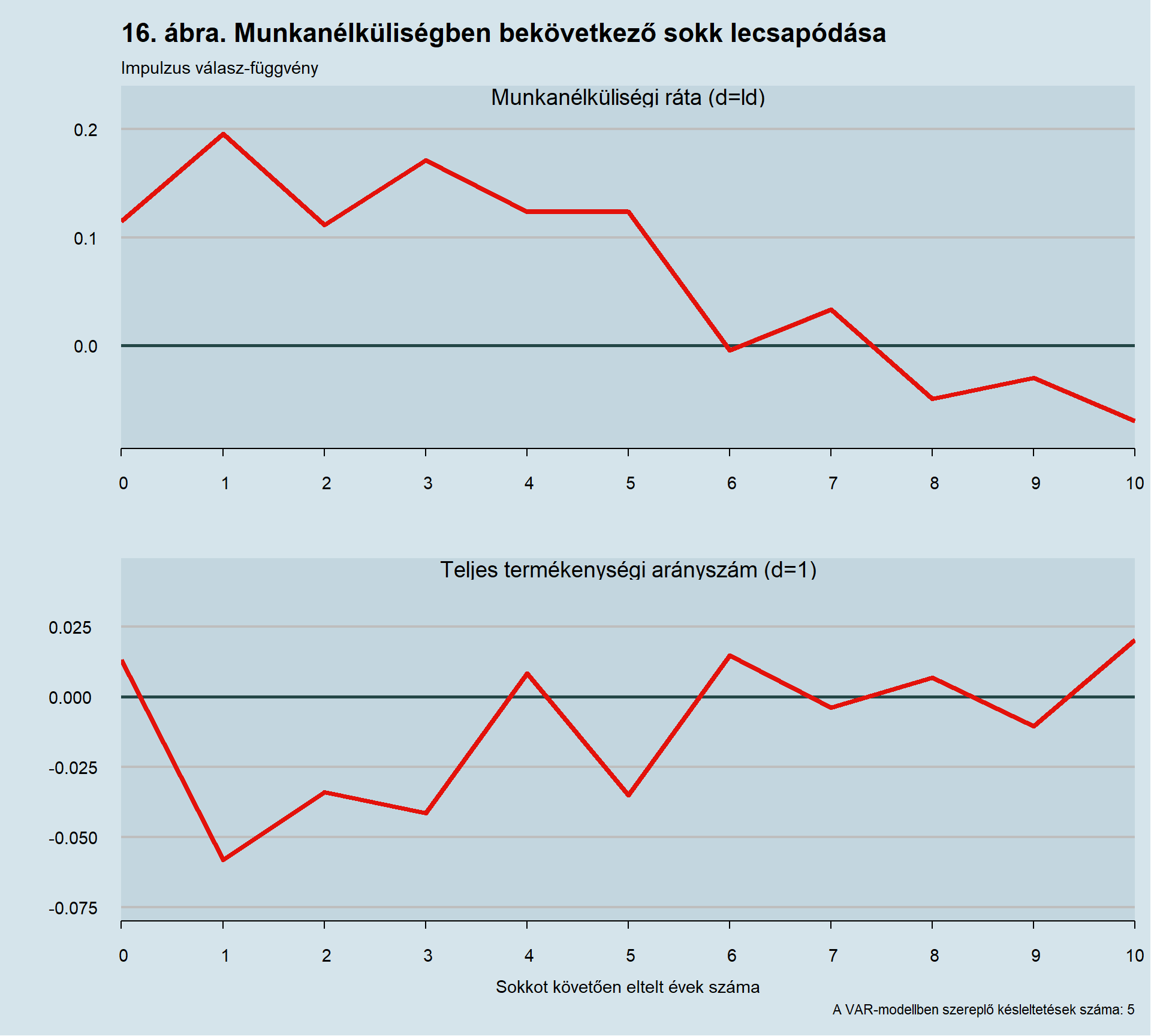 A kihagyott változó okozat lehetséges torzítás elkerüléséért az 5-ös késleltetésű VAR-modellt vizsgálom meg. Az impulzus válaszfüggvények a 16. ábrán láthatók, amin látható, hogy a munkanélküliség és a termékenységi arányszám között negatív irányú kapcsolat áll fenn.
