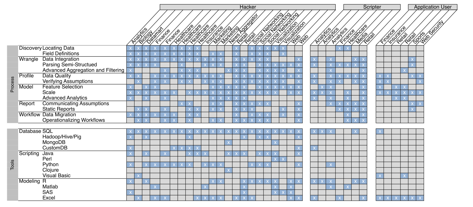 Scripters take care of advanced modeling and use a software package such as R or Matlab extensively. They are less proficient when parsing log files or scraping data off the web, and the data susceptible for modeling are often prepared by IT staff.