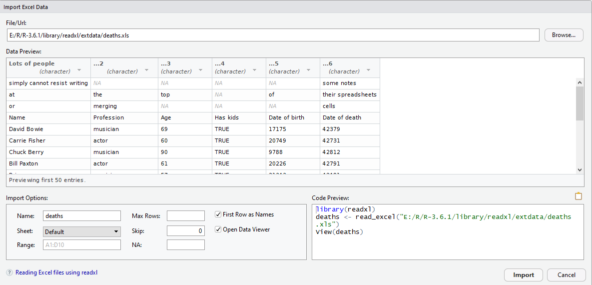 对于deaths.xlsx这个Excel文件,可以结合使用n_max 和 skip 参数去除不想读取的部分(分别对应图形界面里的Max Rows和Skip: