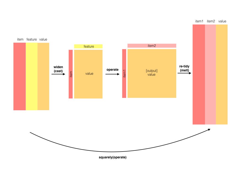 For this reason, it is sometimes necessary to “cast” a tidy dataset into a wide matrix (such as a co-occurrence matrix), performs an operation such as a correlation on it, then re-tidies the result. This is when widyr comes to the rescue, the workflow is shown in the book: