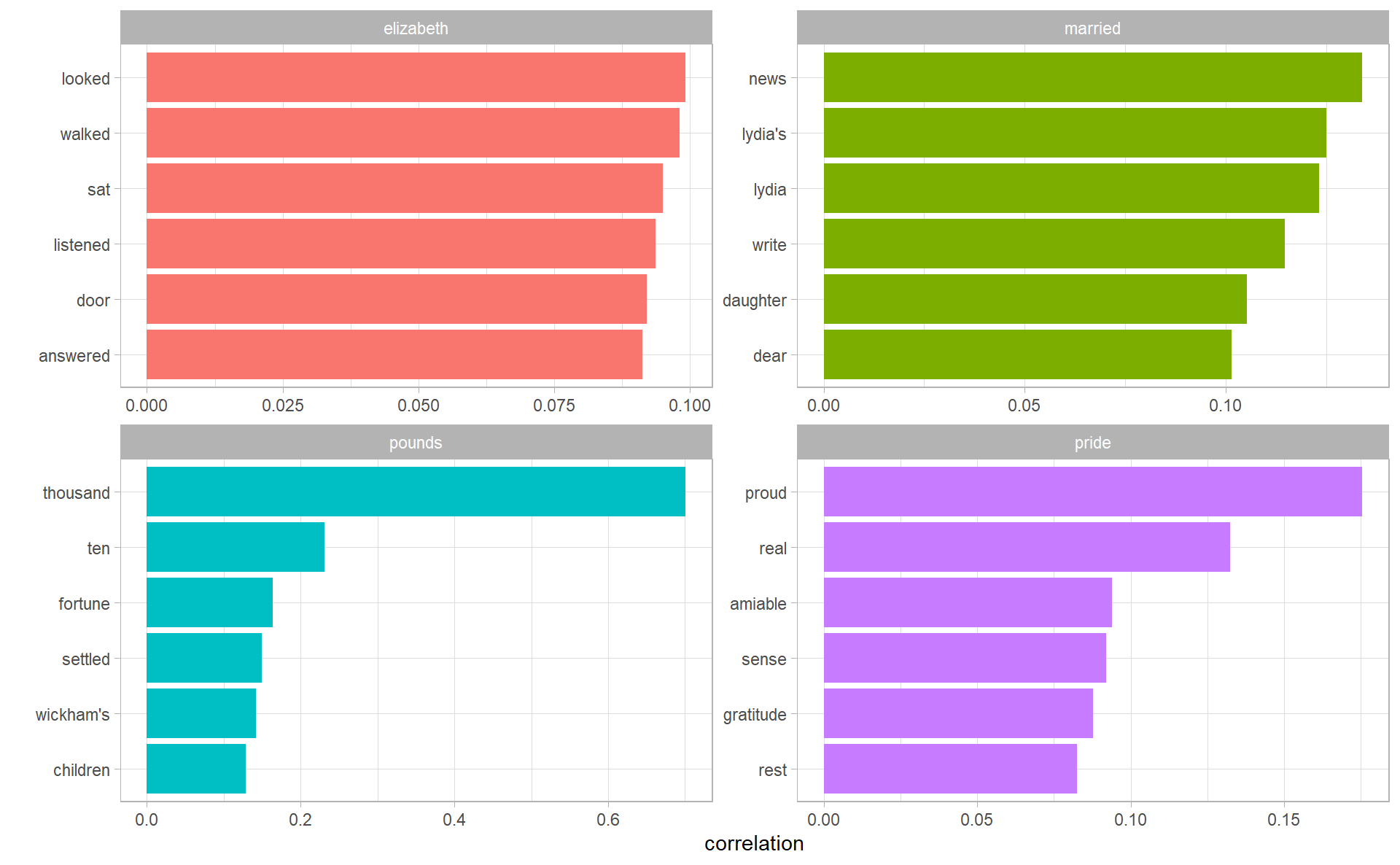 Pairs like “Elizabeth” and “Darcy” are the most common co-occurring words, but that’s not particularly meaningful since they’re also the most common individual words. We may instead want to examine correlation among words, which indicates how often they appear together relative to how often they appear separately.