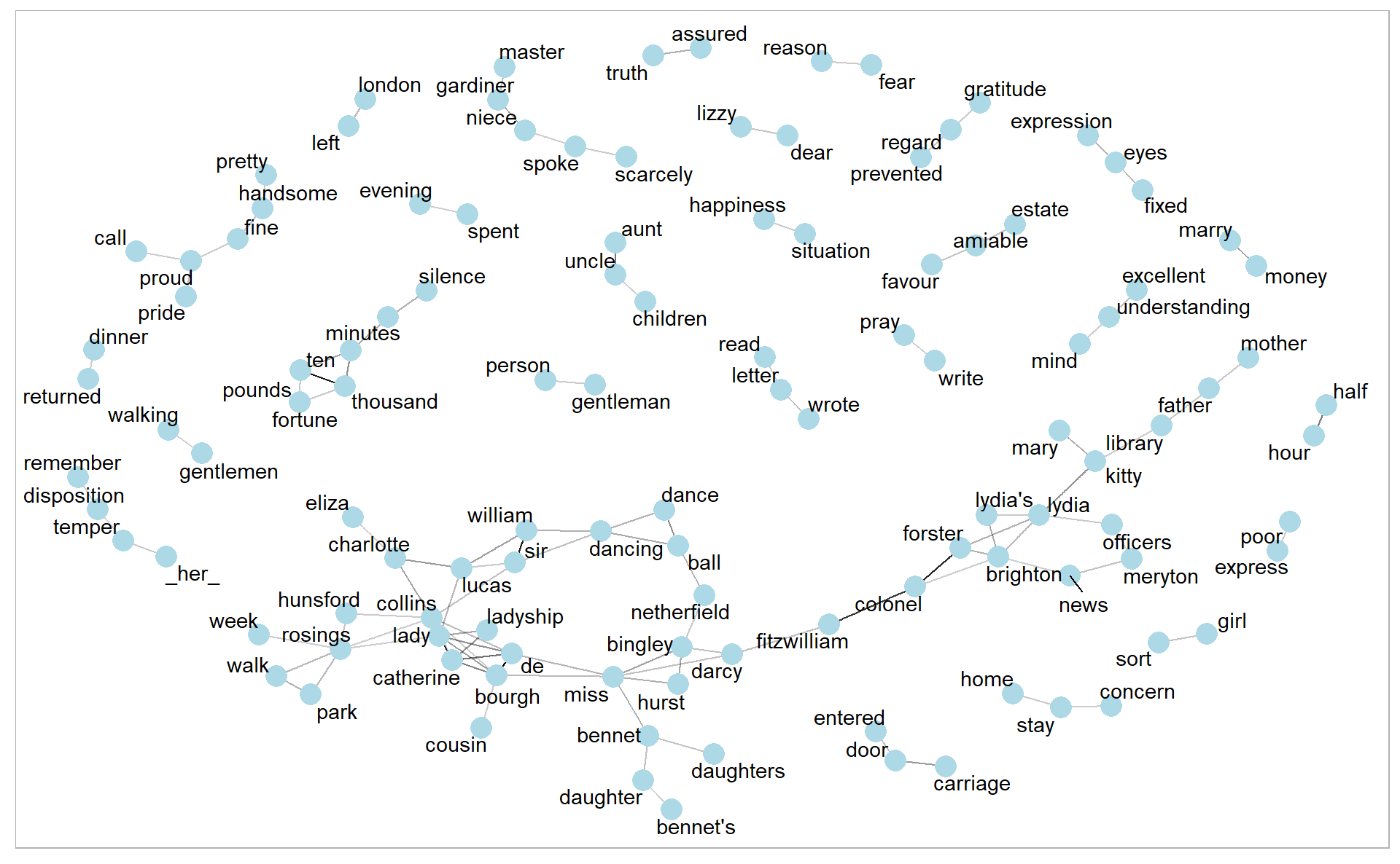 Note that unlike the bigram analysis, the relationships here are symmetrical, rather than directional (there are no arrows). We can also see that while pairings of names and titles that dominated bigram pairings are common, such as “colonel/fitzwilliam”, we can also see pairings of words that appear close to each other, such as “walk” and “park”, or “dance” and “ball”.