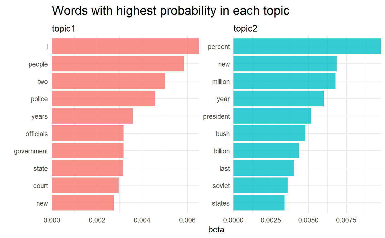 #> # ... with 20,940 more rowsWhich words have a relateve higher probabiltity to appear in each topic?