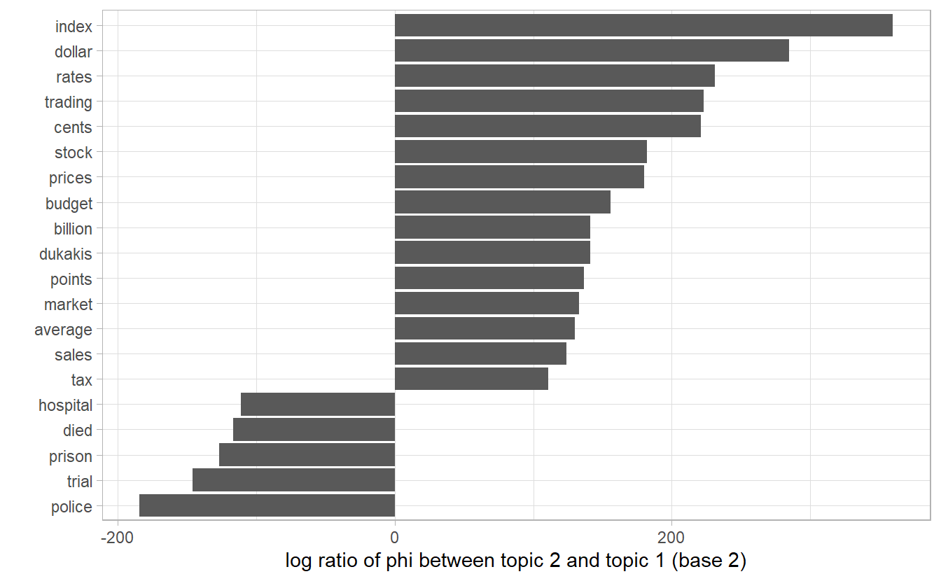 As an alternative, we could consider the terms that had the greatest difference in \(\vec{\phi_k}\) between topic 1 and topic 2. This can be estimated based on the log ratio of the two: \(\log_2(\frac{\phi_{1n}}{\phi_{2n}})\), \(\phi_{1n} / \phi_{2n}\) being the probability ratio of the sam e word \(n\) in two topics (a log ratio is useful because it makes the difference symmetrical)