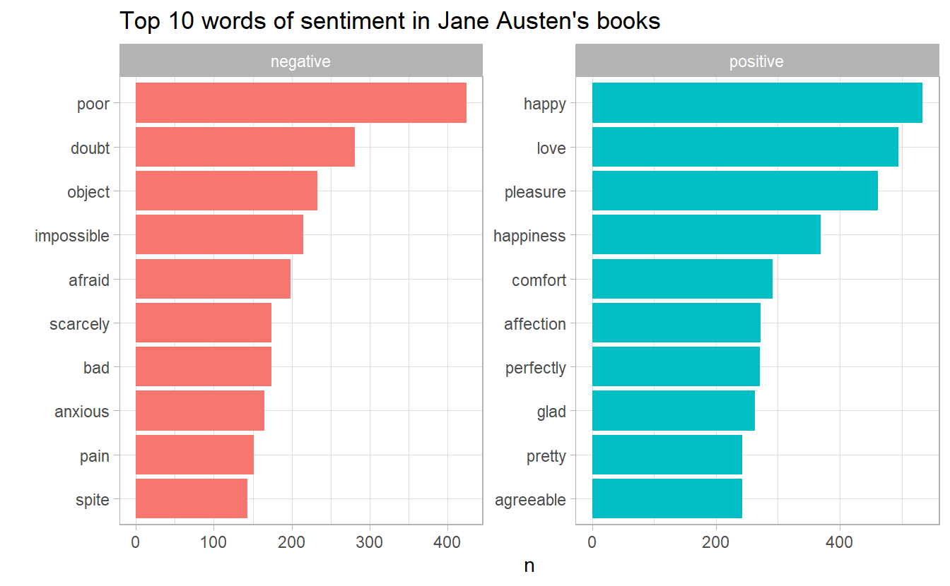 #> # ... with 2,579 more rowsThe word “miss” is coded as negative but it is used as a title for young, unmarried women in Jane Austen’s works. If it were appropriate for our purposes, we could easily add “miss” to a custom stop-words list using bind_rows(). We could implement that with a strategy such as this: