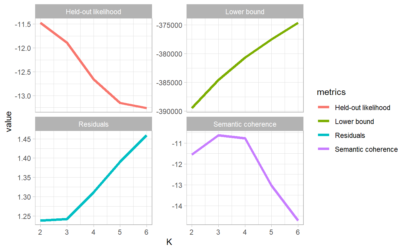 To compare topic models (not necessarily LDA) with different number of topic \(K\), we need first to propose metrics for comparison or topic quality. Semantic coherence s maximized when the most probable words in a given topic frequently co-occur together, which correlates human judgement of topic quality.