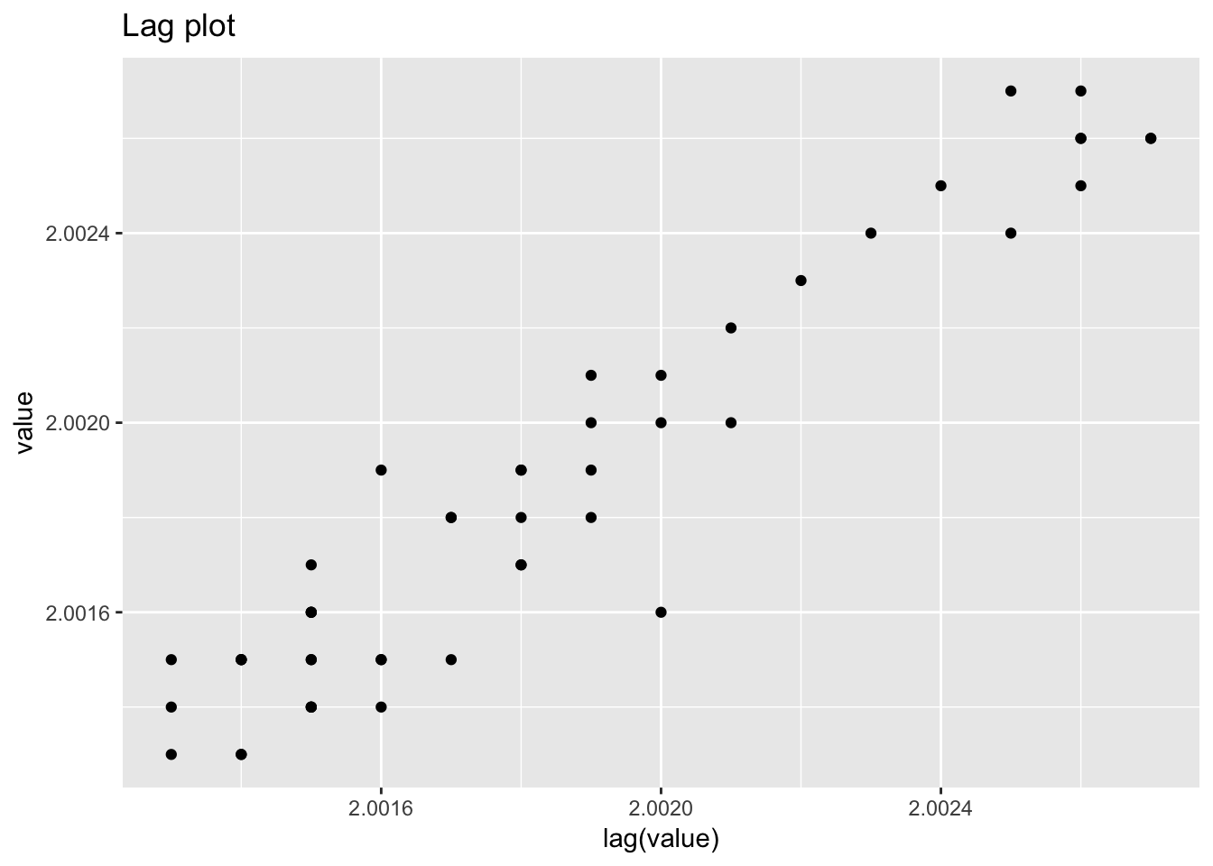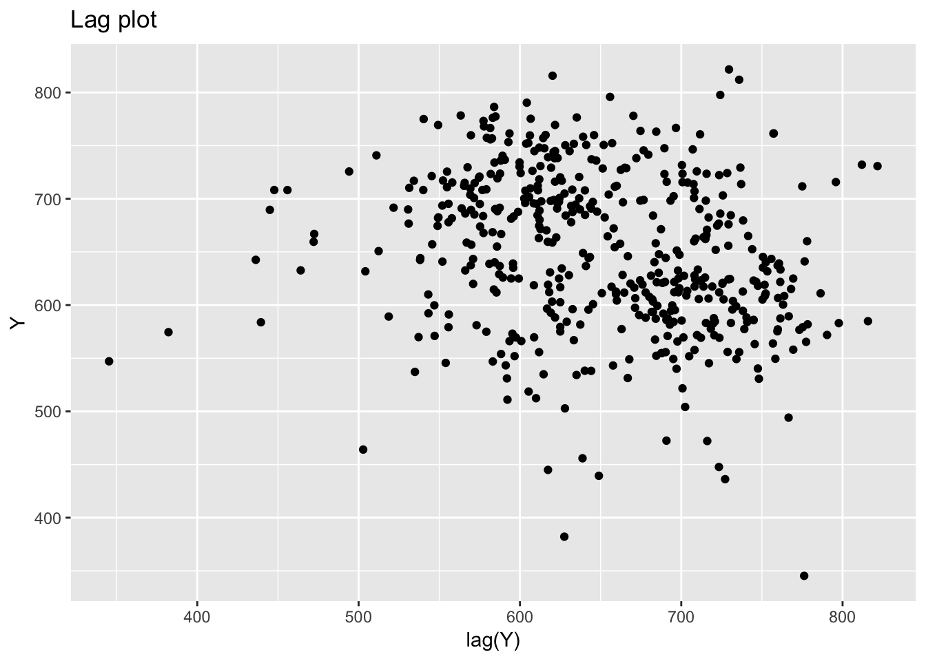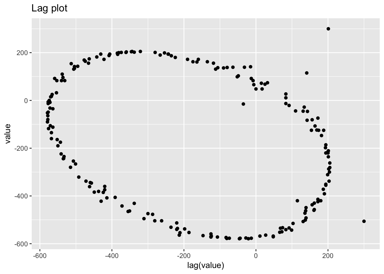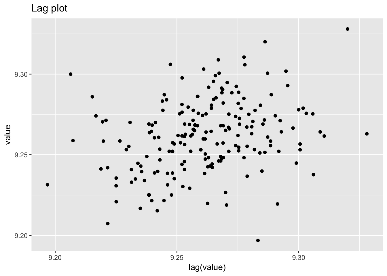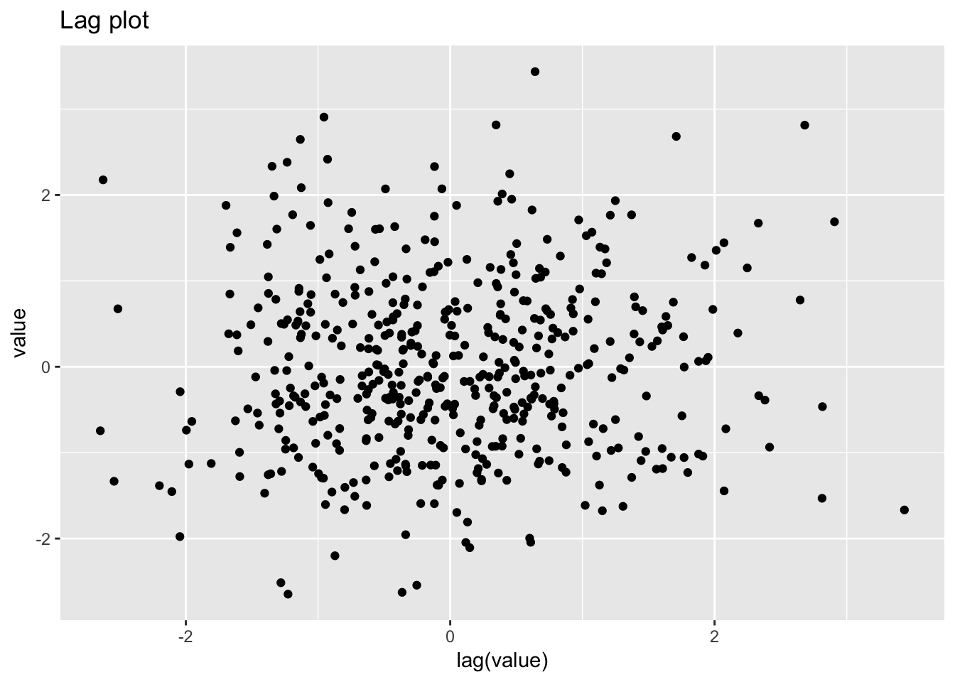 labs(title = "Lag plot")## Warning: Removed 1 rows containing missing values (geom_point).