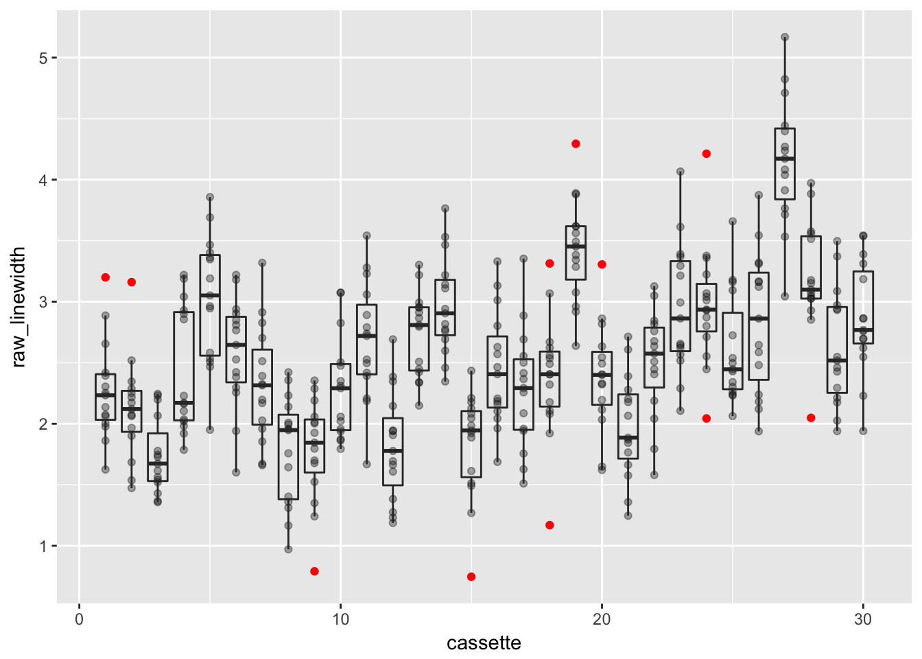geom_boxplot(aes(cassette, raw_linewidth, group = cassette), alpha = 0, outlier.alpha = 1, outlier.colour = "red")