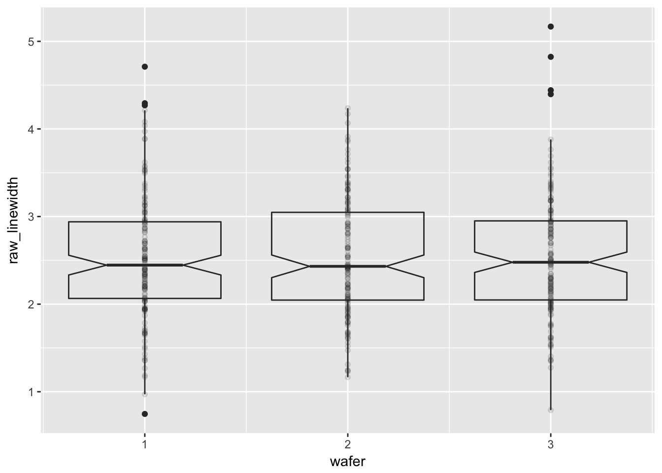 geom_boxplot(aes(wafer, raw_linewidth, group = wafer), alpha = 0, notch = TRUE, outlier.alpha = 1)