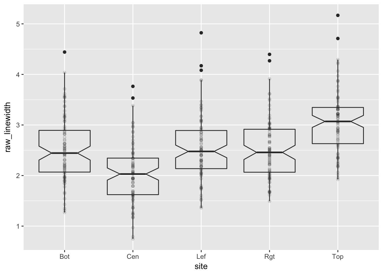 geom_boxplot(aes(site, raw_linewidth), alpha = 0, notch = TRUE, outlier.alpha = 1)