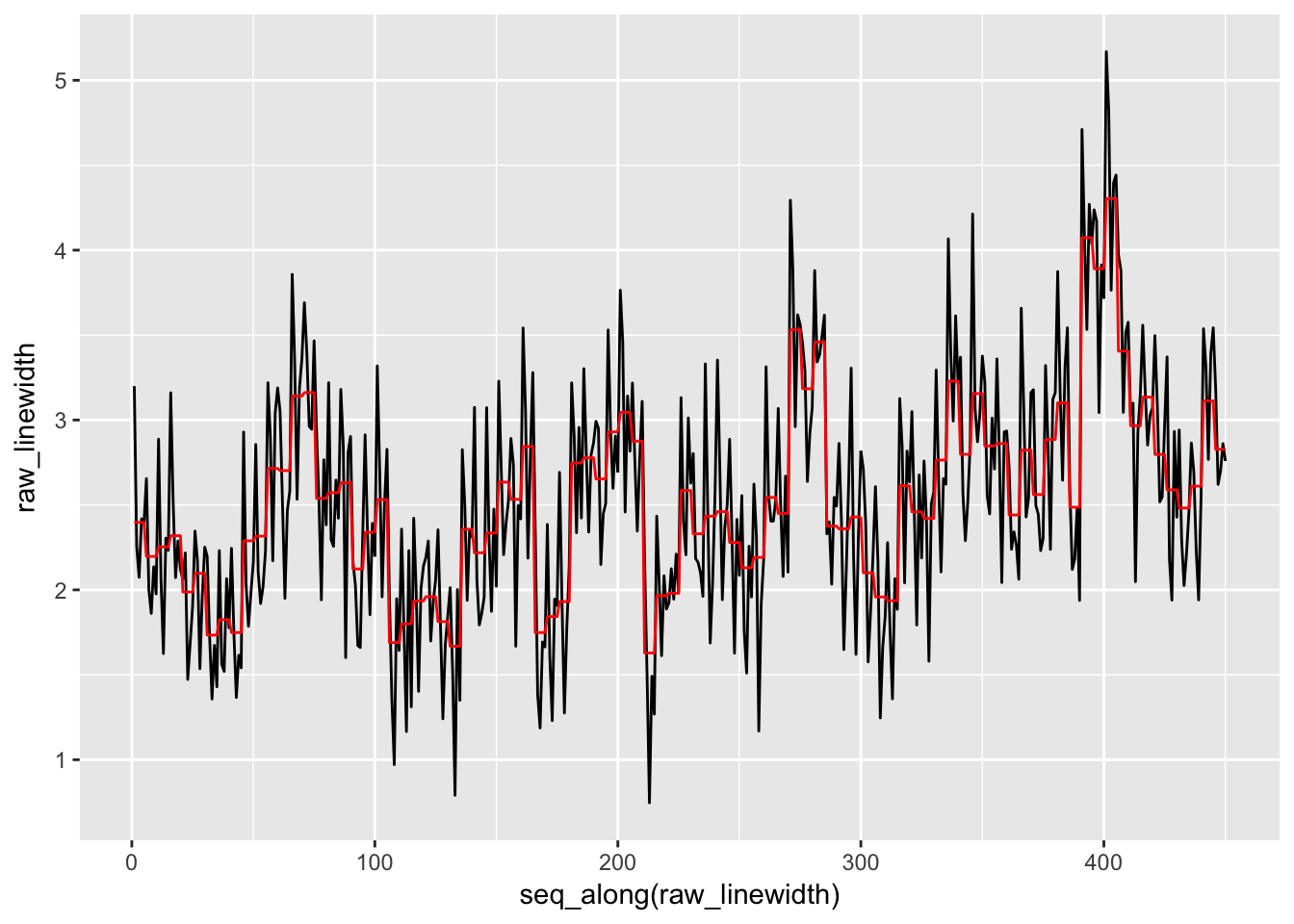 geom_line(aes(seq_along(raw_linewidth), .fitted), colour = "red")