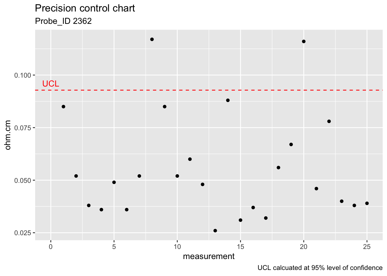 labs(title = "Precision control chart", subtitle = "Probe_ID 2362", x = "measurement", y = "ohm.cm", caption = "UCL calcuated at 95% level of confidence") +