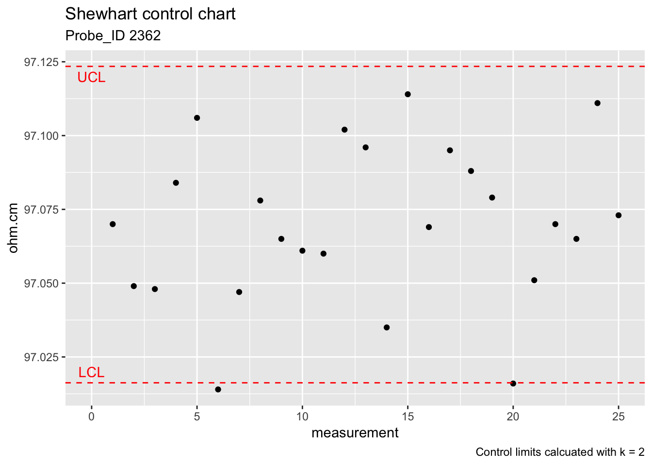 labs(title = "Shewhart control chart", subtitle = "Probe_ID 2362", x = "measurement", y = "ohm.cm", caption = "Control limits calcuated with k = 2") +
