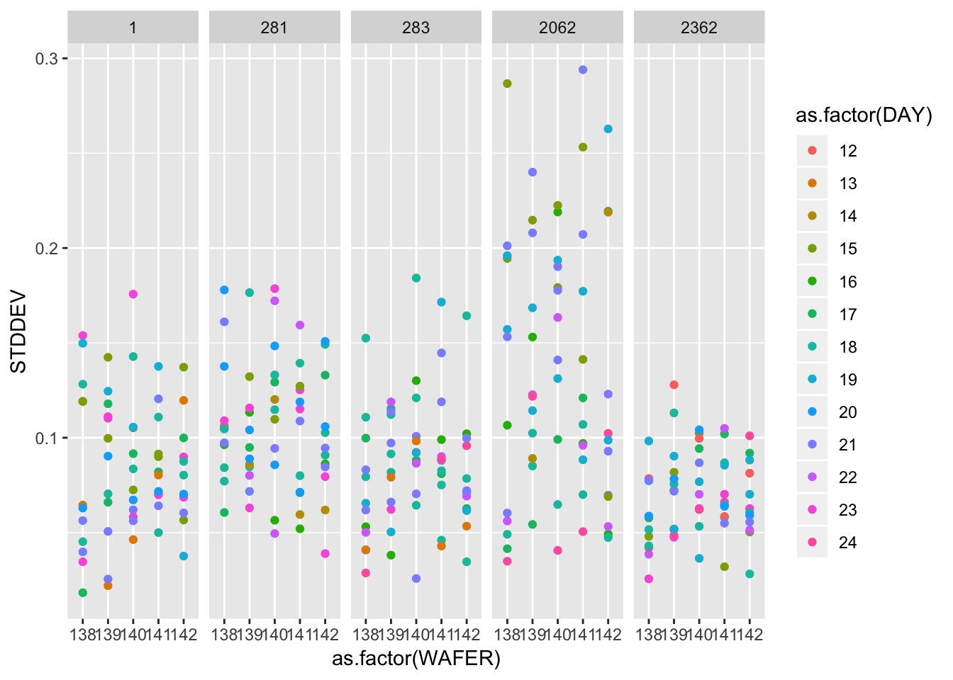 A graphical analysis shows repeatability standard deviations plotted by wafer and probe… The plots show that for both runs the precision of this probe is better than for the other probes.