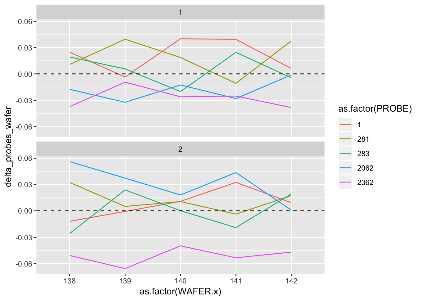 geom_line(aes(as.factor(WAFER.x), delta_probes_wafer, group = as.factor(PROBE), colour = as.factor(PROBE))) +