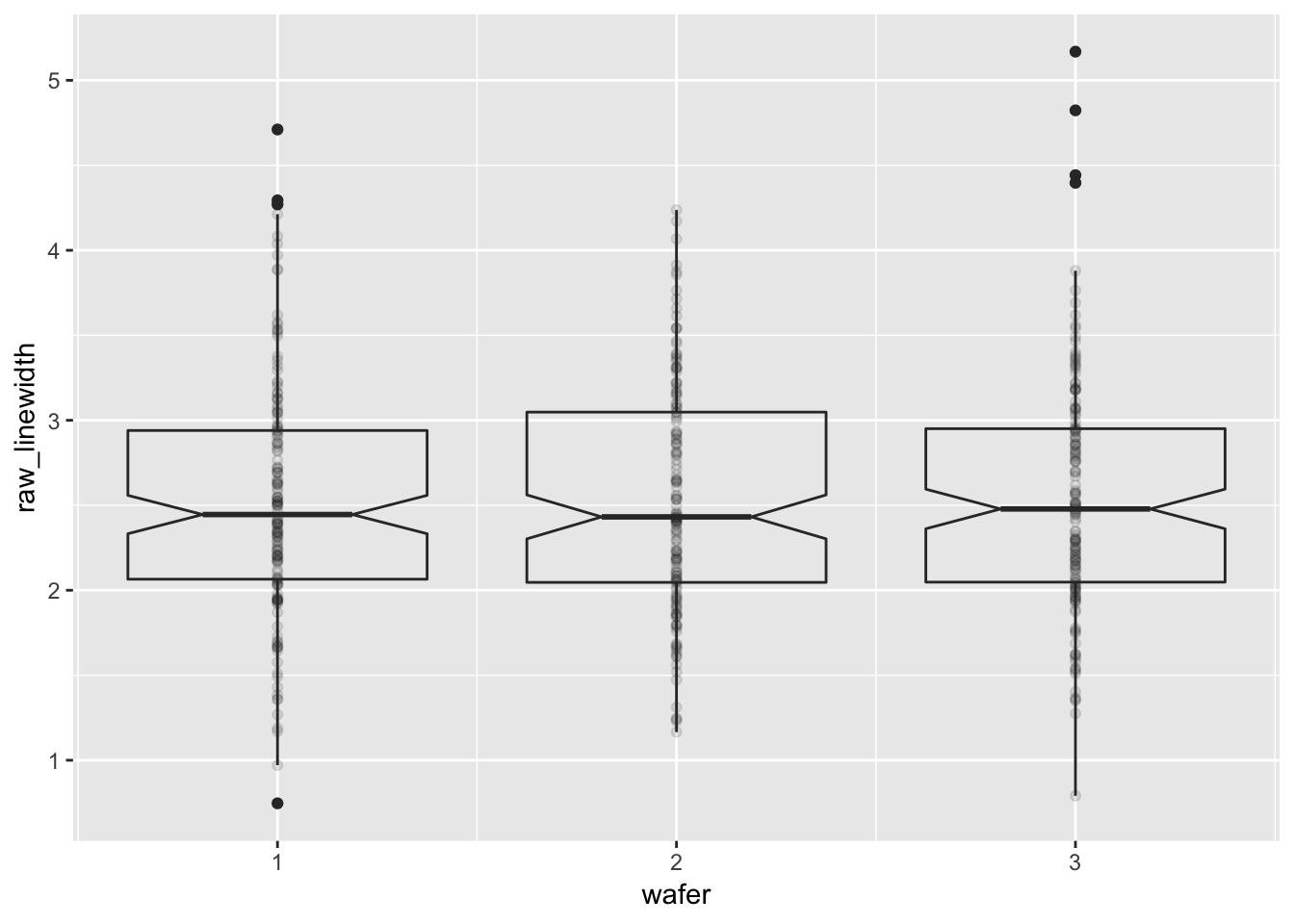 geom_boxplot(aes(wafer, raw_linewidth, group = wafer), alpha = 0, notch = TRUE, outlier.alpha = 1)
