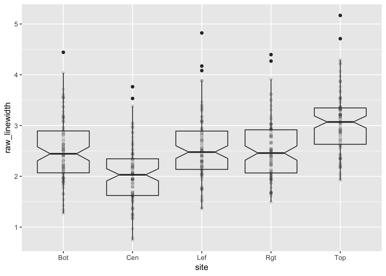 geom_boxplot(aes(site, raw_linewidth), alpha = 0, notch = TRUE, outlier.alpha = 1)