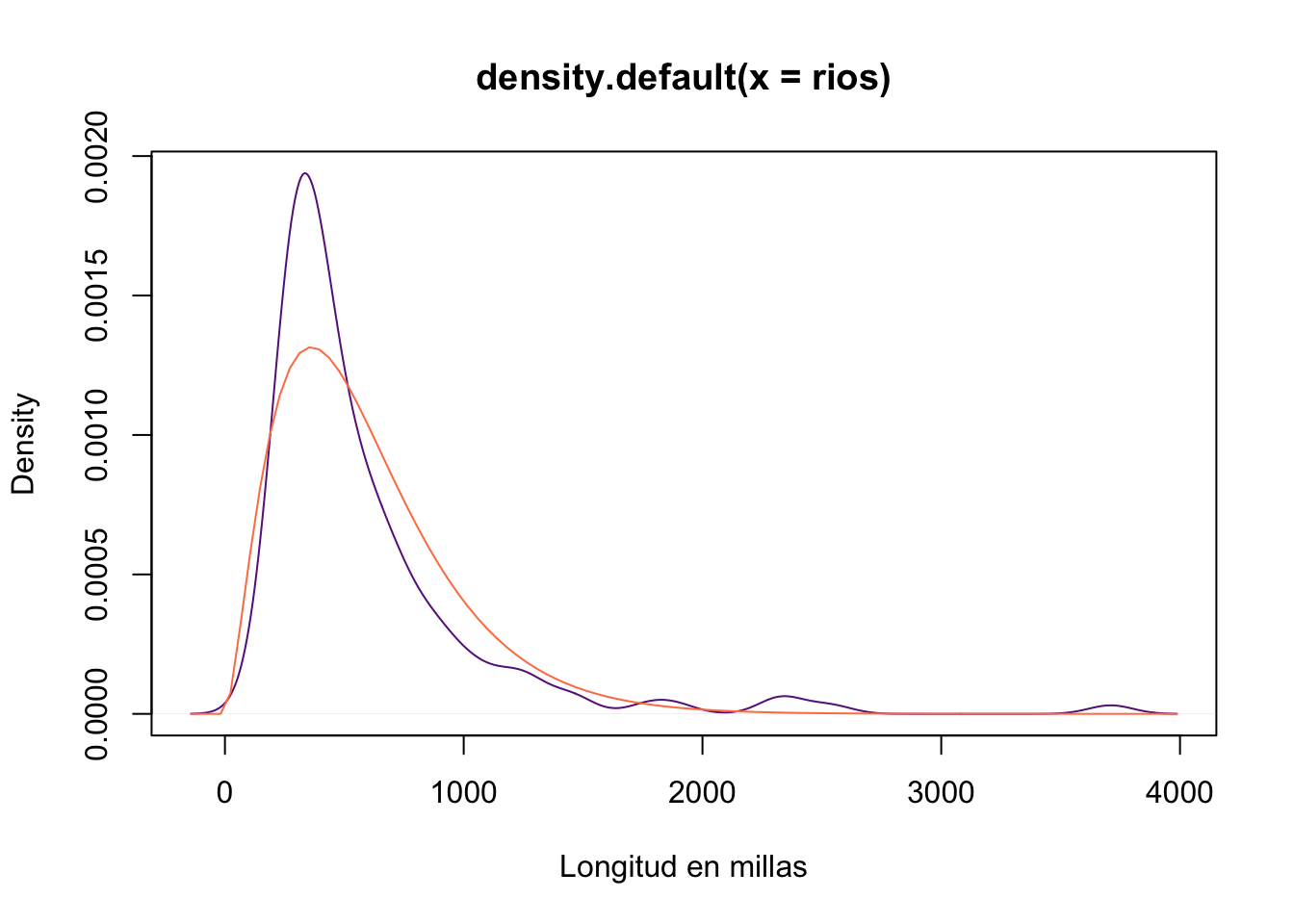 plot(density(rios), col="darkorchid4",xlab="Longitud en millas")