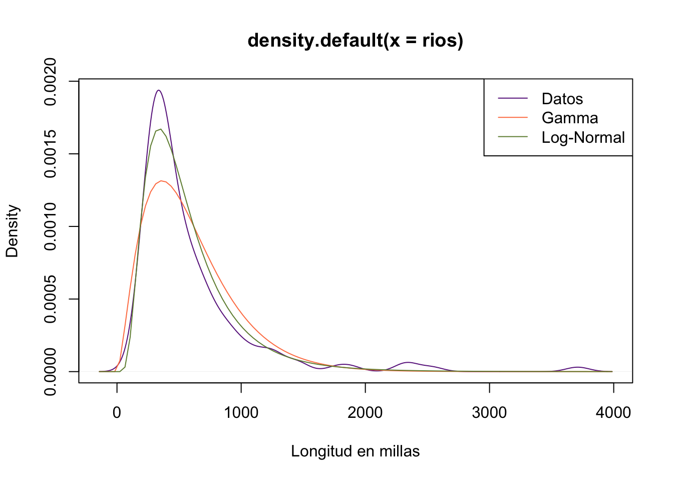 - Encuenre la probabilidad de que un rio tenga una longitud menor a 1000 millas usando: los datos, el ajuste gamma y el ajuste log-normal