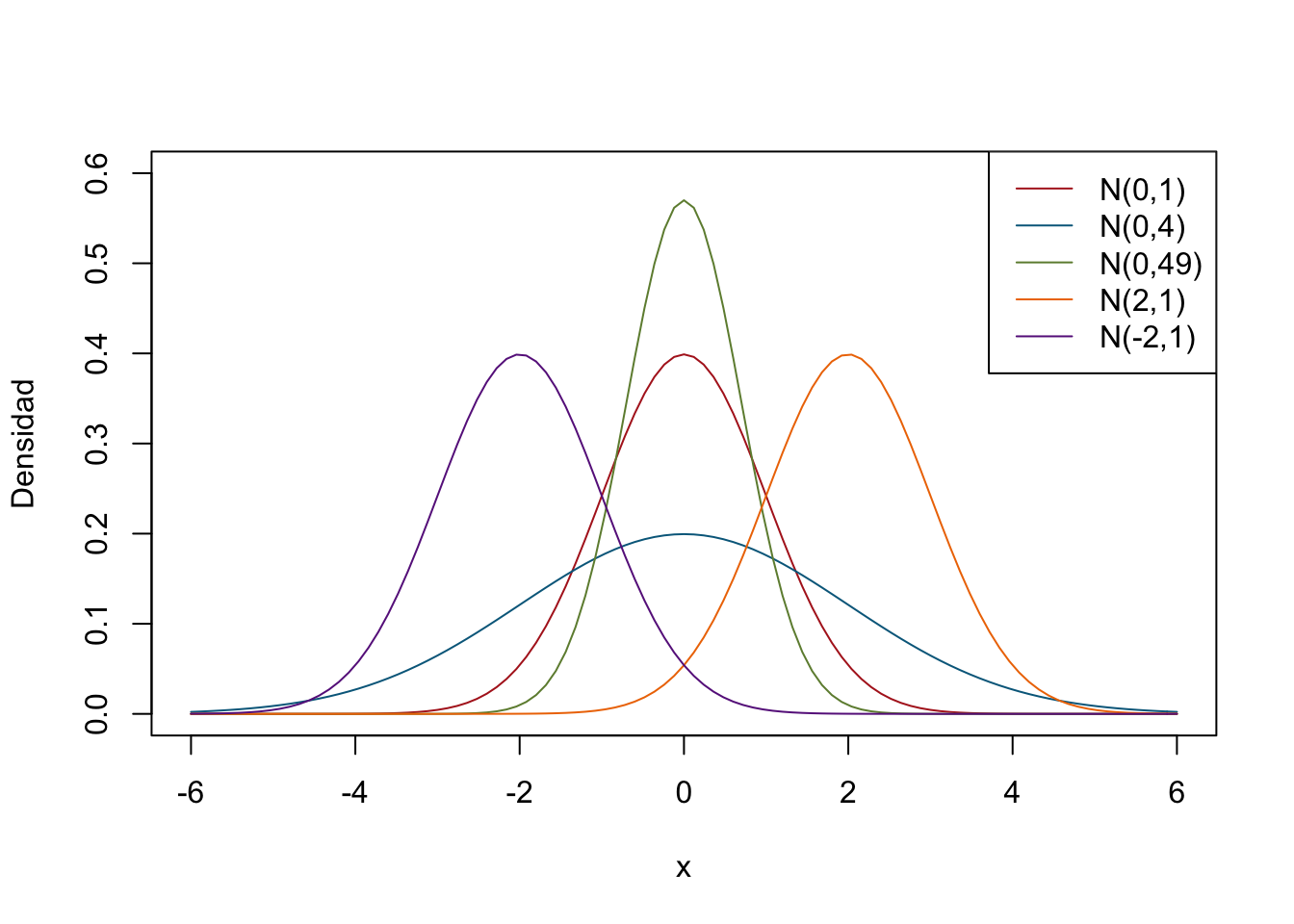legend = c("N(0,1)","N(0,4)","N(0,49)","N(2,1)","N(-2,1)"),