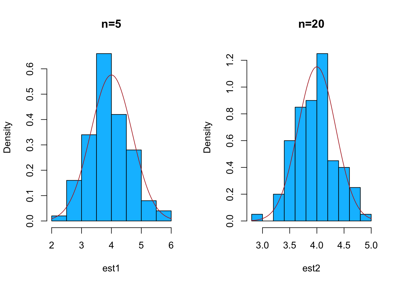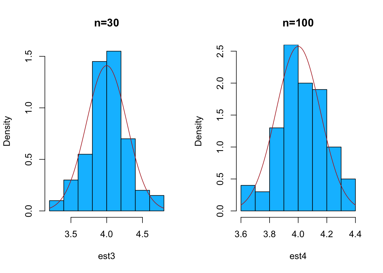 est2 <- replicate(Nrep, mean(mean(rbinom(n[2], size = 10, prob = 0.4))))