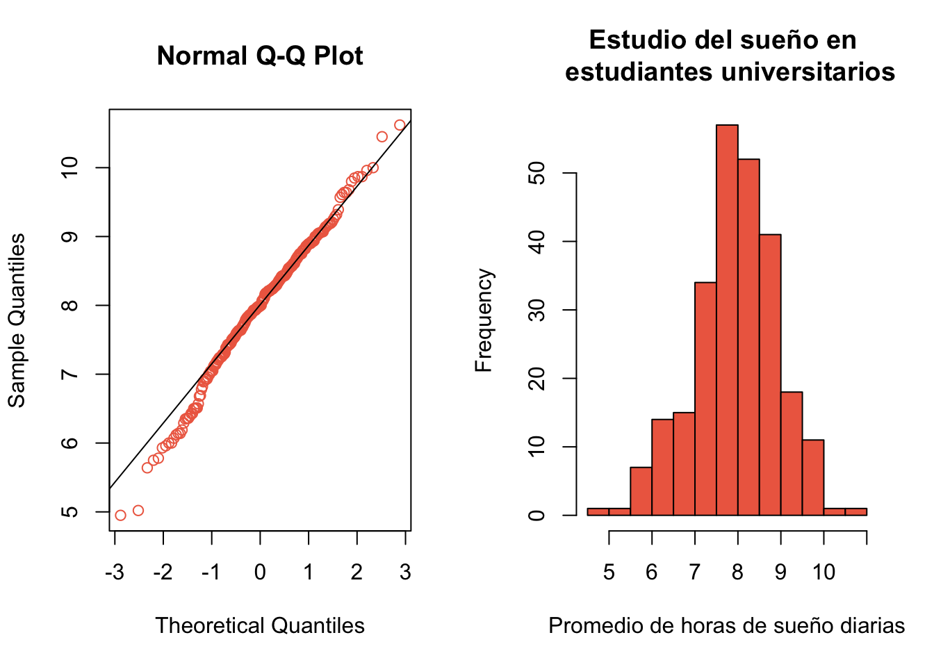 Notemos que el valor p > 0.05, por lo tanto no podemos rechazar \(H_0\) y decimos que las evidencias no son suficientes para afirmar que el los estudiantes no está durmiendo el número adecuado de horas. Por otro lado notemos que el intervalo de confianza del 95% para el número promedio de horas es
