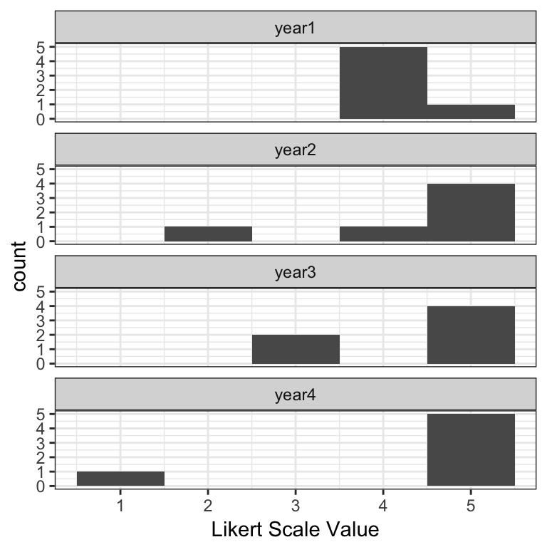 Histograms of the actual score values are the best way to visualize Likert data—they have two real axes, showing counts by score value or category, so you can parse the visual and understand the results very quickly. Using the same data as above, you can instantly see that the “improvement” in year 2 was perhaps not an improvement after all: while most respondents appear to be satisfied above what they thought in year 1, one respondent may be at risk of leaving.