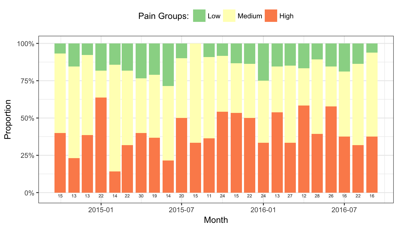 In this example (Figure 9), the maximum pain score for each patient in the 24 hours following a surgery are recorded, and assigned to a pain category. The total number of patients with maximum pain scores in each pain category are summed each month.