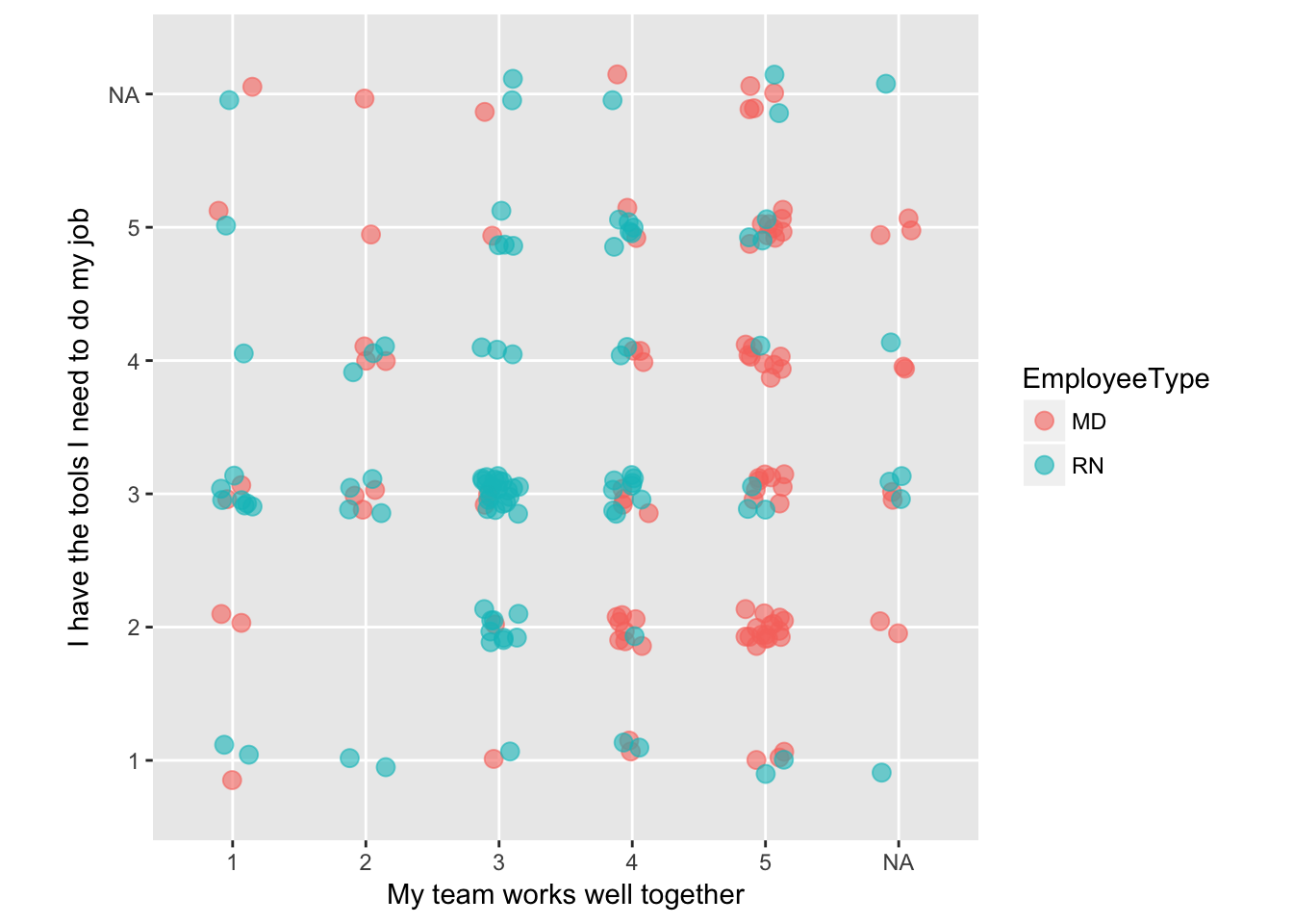 Scatterplot of ordinal comparisons (jittered to show point density) between the questions ‘My team works well together’ and ‘I have the tools I need to do my job’.
