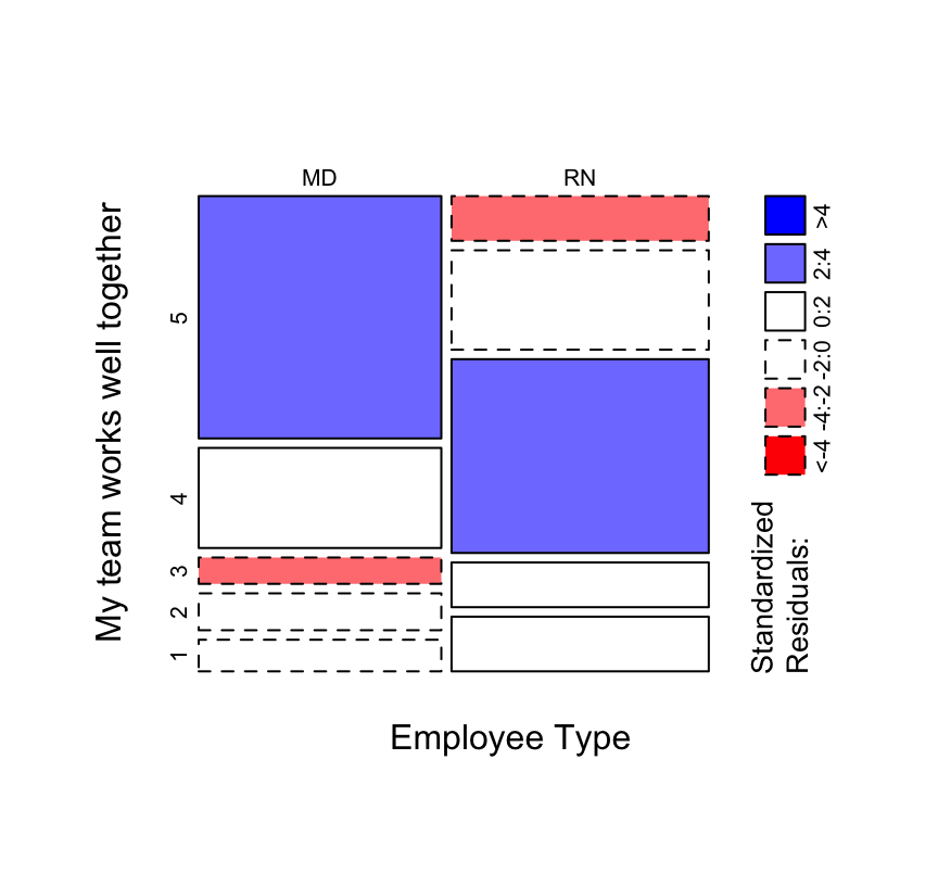 Mosaic plot between Employee Type and responses to the ‘My team works well together’ question.
